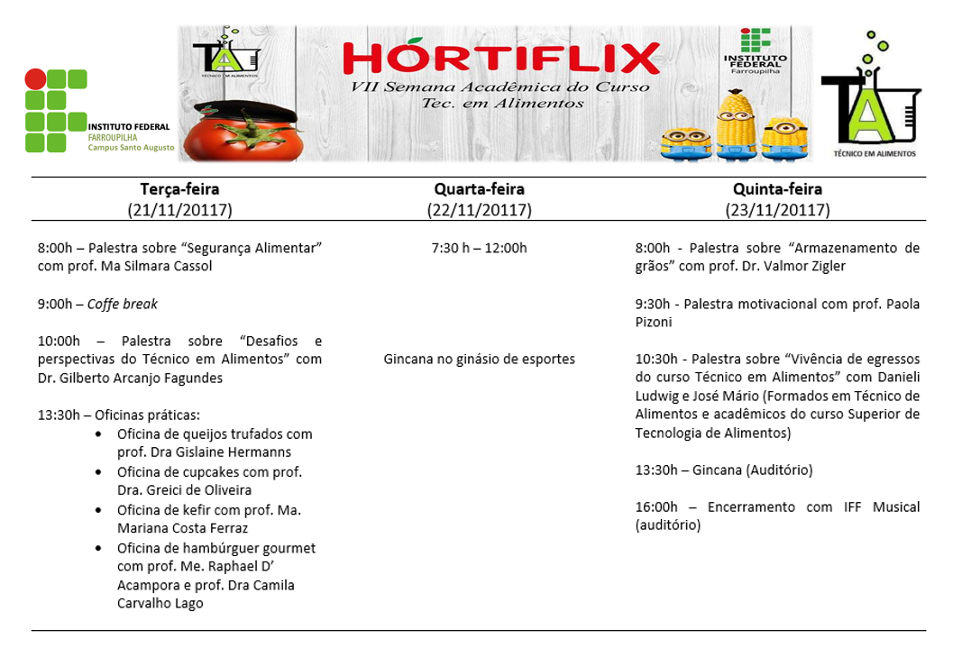 Na programação, na terça-feira, dia 21, o evento iniciou com a palestra sobre “Segurança Alimentar”, ministrada pela Me. Silmara Cassol, seguida pela palestra sobre “Desafios e Perspectivas do Técnico em Alimentos”, com o Dr. Gilberto Arcanjo Fernandes. Na tarde desse primeiro dia aconteceram as oficinas de “Queijos Trufados” com a professora Dr. Gislaine Hermanns, de “Cupcakes” com a professora Dra. Greici Oliveira, de Kefir com a professora Me. Mariana Costa Ferraz e de Hambúrguer Gourmet com os professores Me. Raphael d’Acampora e Dra. Camila Carvalho Lago. Na quarta-feira, dia 22, foram realizadas as provas da Gincana de integração.