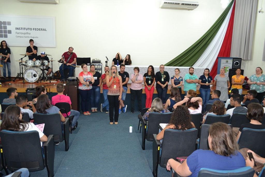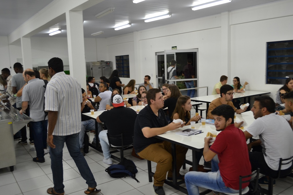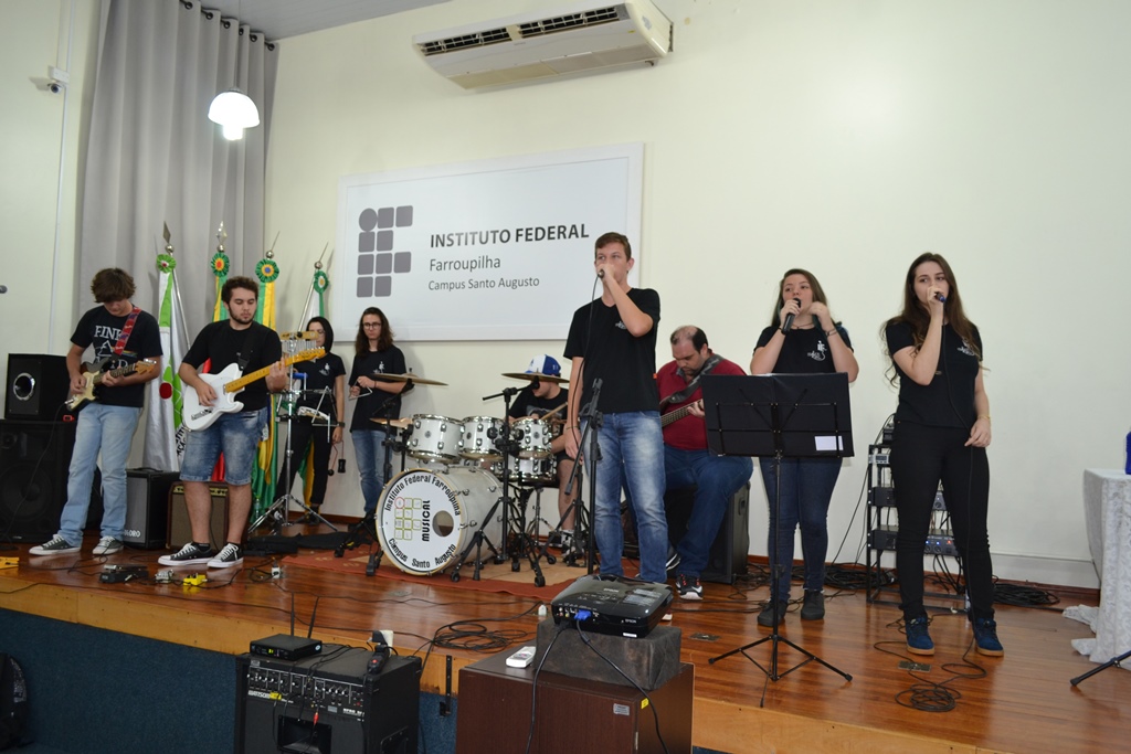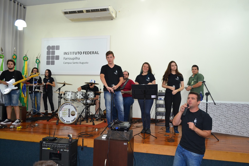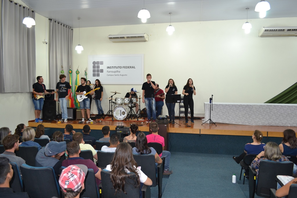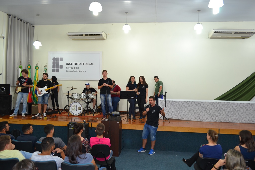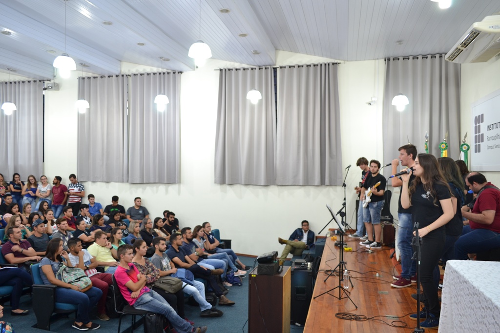 À noite os alunos dos cursos superiores e PROEJA participaram no auditório das atividades de acolhida. A programação contou com boas vindas da equipe diretiva e apresentação da Banda IF Musical, que ao som de clássicos do MPB, animou a noite de calouros e veteranos. Após o show, todos receberam um lanche especial no refeitório da instituição.