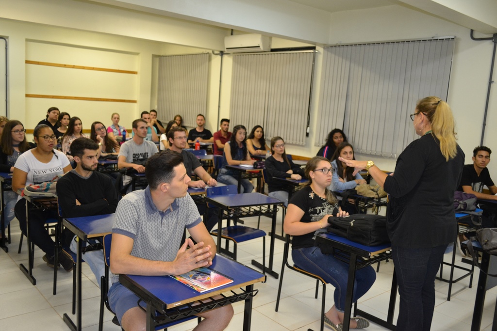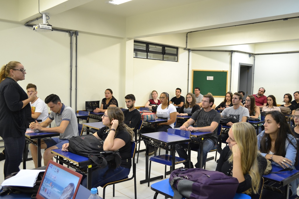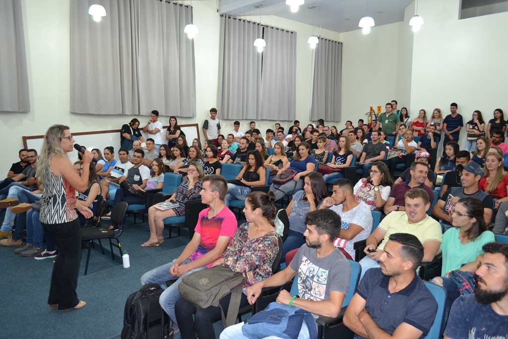 Os 40 alunos da 1ª turma do Bacharelado em Administração, depois do lanche, foram recebidos na sala de aula pela coordenadora do curso, professora Maira Pizolotto, que deu algumas orientações e conduziu as atividades de integração.