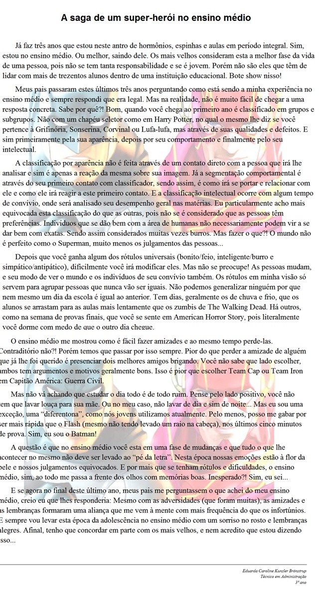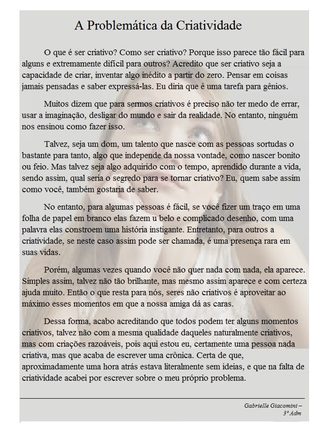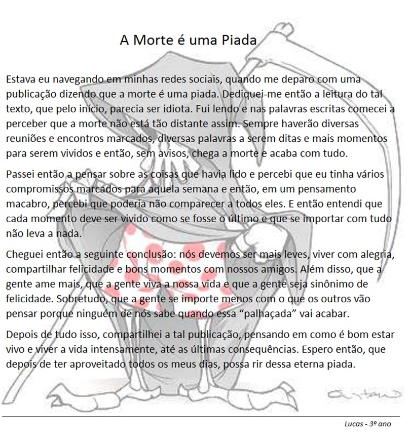 Com títulos como “A morte é uma Piada”; “O cativeiro de nossa Escrita”; “A Crônica na Crônica”; “A Problemática da Criatividade”; “A Faixa Um” e “A Saga de um super-heroi no Ensino Médio”; os alunos abordaram assuntos ligados ao comportamento humano, à própria vivência como estudante, e à dificuldade em materializar esse tipo de trabalho, ou seja: escrever uma crônica. Alguns conseguiram “tirar de letra” a façanha, falando justamente de suas limitações, afinal, a própria falta de assunto, já é um assunto...