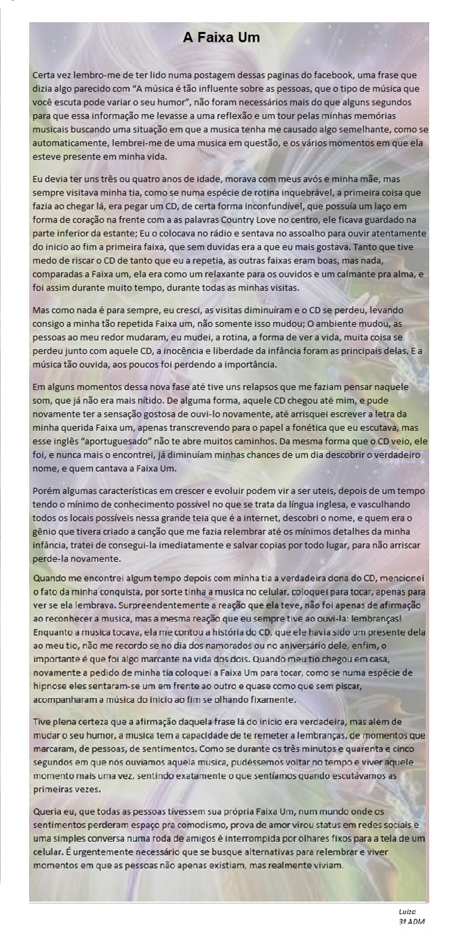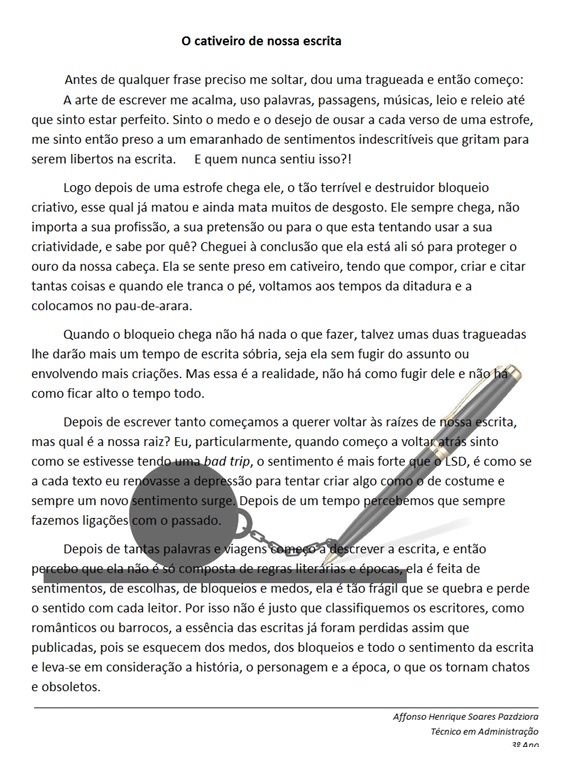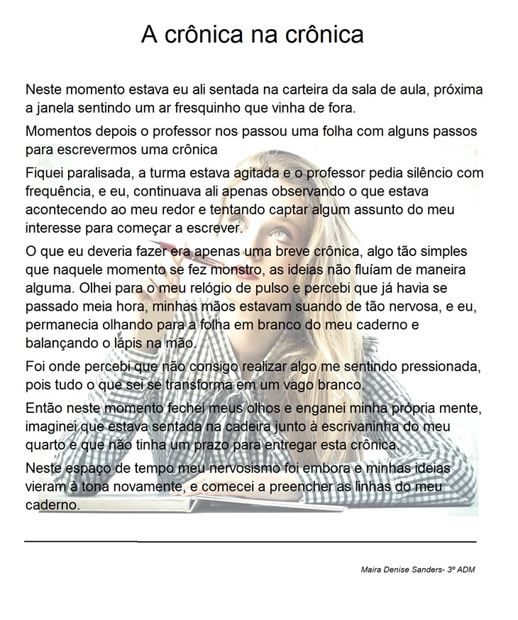 em Administração do IF Farroupilha – Campus Santo Augusto, que logo depois de estudar as funções e estrutura da crônica foi desafiada a escrever, sobre qualquer tema. Surgiram bons textos, alguns inclusive bem consistentes. “Eu achei o nível excelente” – disse o professor; “o que demonstra que eles entenderam bem o conceito de crônica, e conseguiram passar isso em seus textos”.