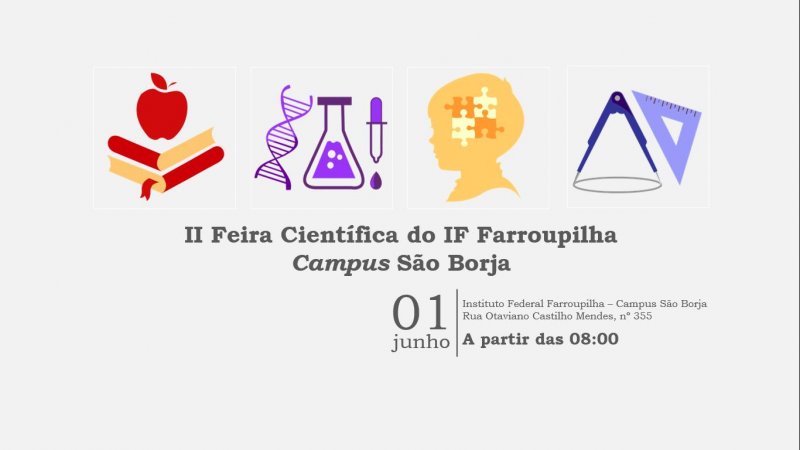Fruto de um projeto de ensino pensado e elaborado por servidores e discentes da instituição, a fim de promover a verticalização do ensino e a articulação entre os componentes curriculares básicos, ocorre no dia 1ª de Junho, a II Feira Cientifica do IF Farroupilha – Campus São Borja. O evento busca oportunizar um espaço para exposição, apresentação e discussão de trabalhos realizados por estudantes e servidores. Além disso, a atividade visa propiciar aos alunos diferentes perspectivas a respeito dos assuntos abordados em sala de aula, consolidando assim os conhecimentos adquiridos nas diferentes áreas da produção científica.