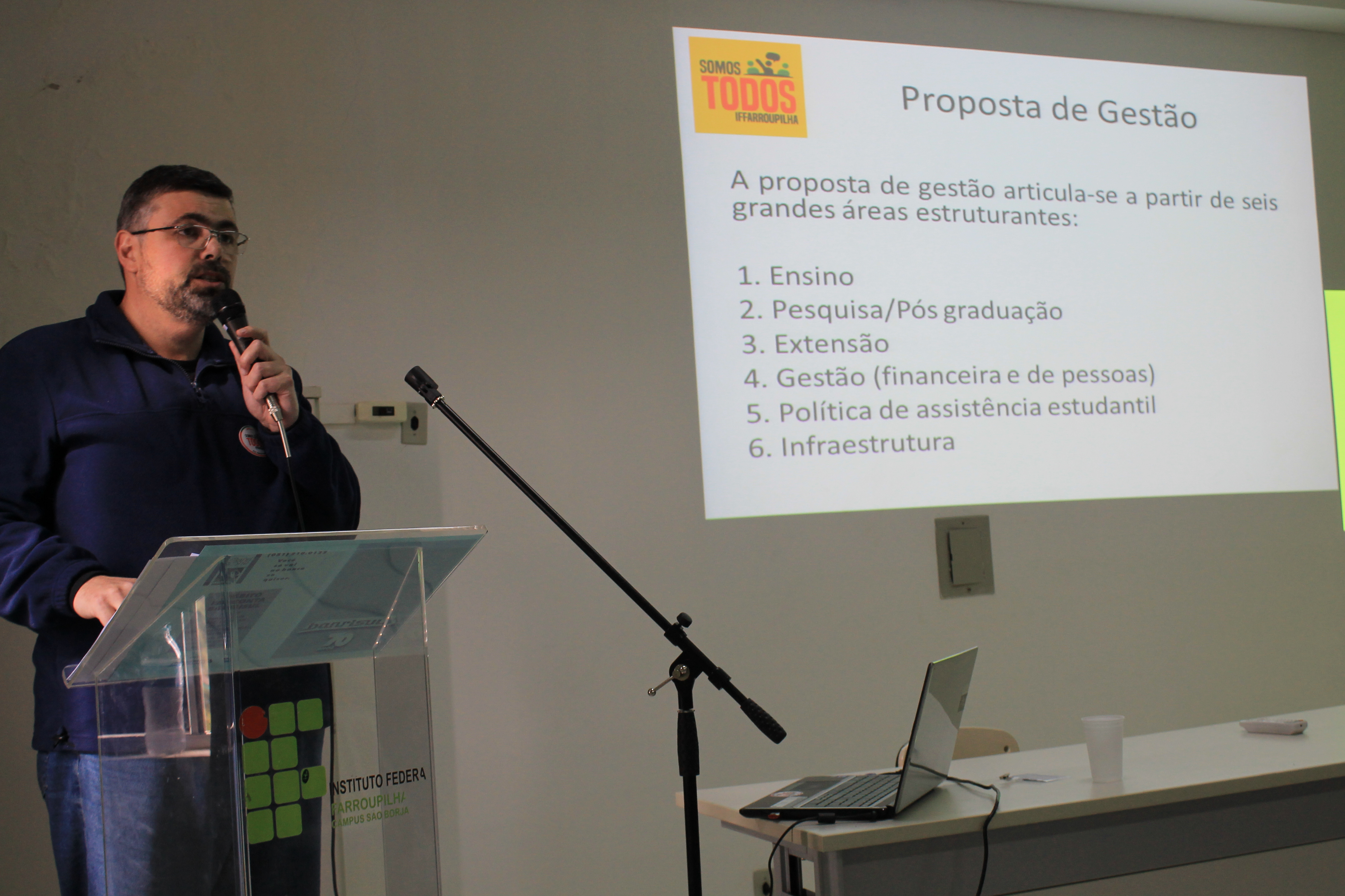 No dia 15/06, foram realizadas às exposições de ideias para os alunos do ensino médio integrado diurno e servidores do Campus São Borja. O debate entre os candidatos está previsto para o dia 23/06, às 19 horas em Uruguaiana e dia 28/06, às 19 horas em São Borja. Será realizado apenas um debate aberto a toda comunidade escolar.