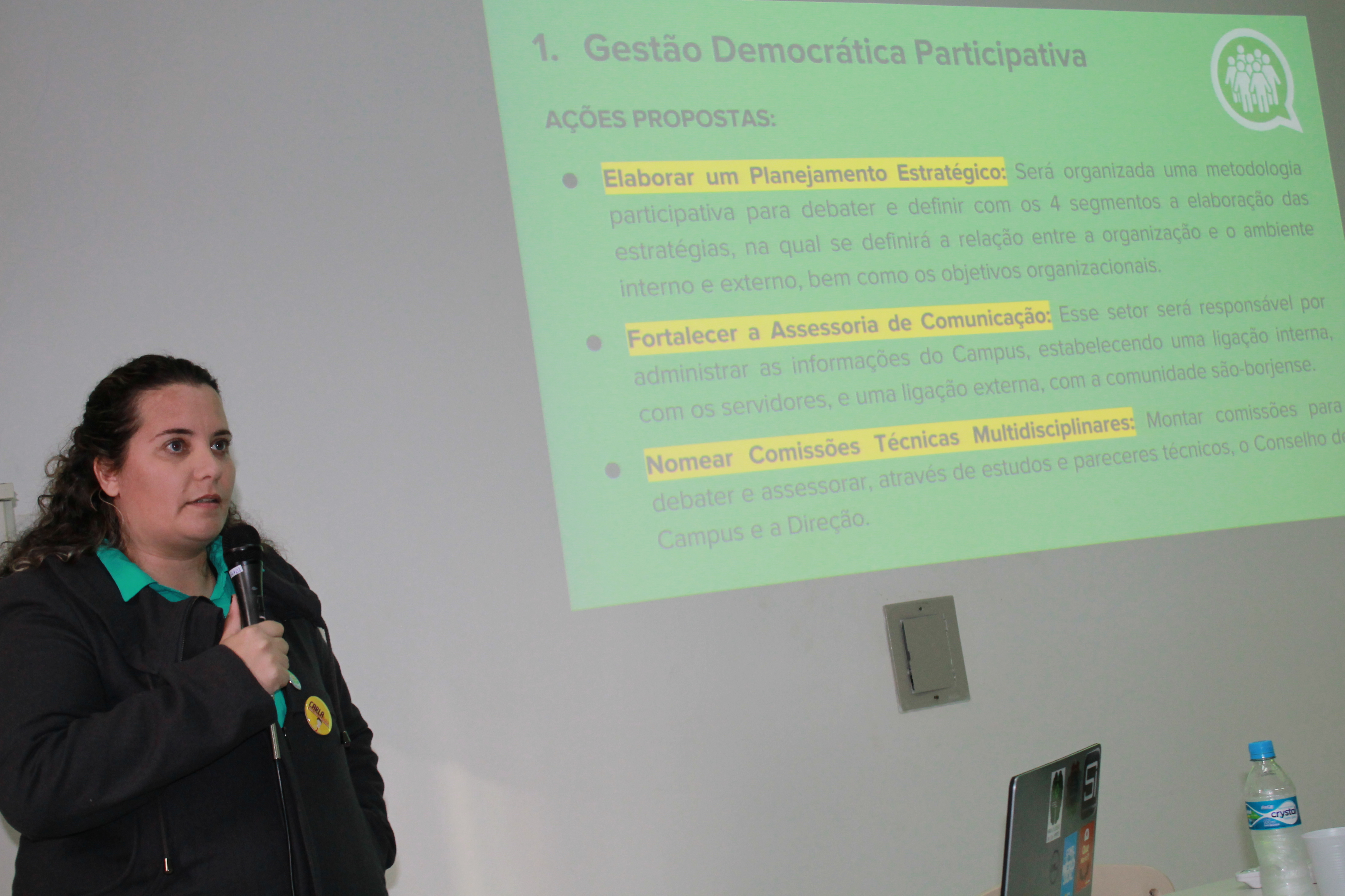 No primeiro eixo, “Gestão Democrática e Participativa”, ela propõe aperfeiçoar e implementar canais de participação com toda a comunidade acadêmica. No eixo “Desenvolvimento Humano”, buscará fortalecer as relações interpessoais entre alunos, servidores e comunidade visando um modelo de educação que coloca as pessoas no centro de desenvolvimento. Já no Eixo de “Qualificação de Ensino e Aprendizagem”, a professora quer potencializar as ações que envolvem a educação, no sentido de contribuir com os professores, estudantes e técnico-administrativos em educação, de maneira que todos possam se integrar e se sentir parte do processo pedagógico. Ela também pretende deixar um horário exclusivo reservado aos alunos para que de forma sistemática possam expor suas demandas à Direção, além de estimular questões pertinentes aos estudantes, como o Grêmio Estudantil.