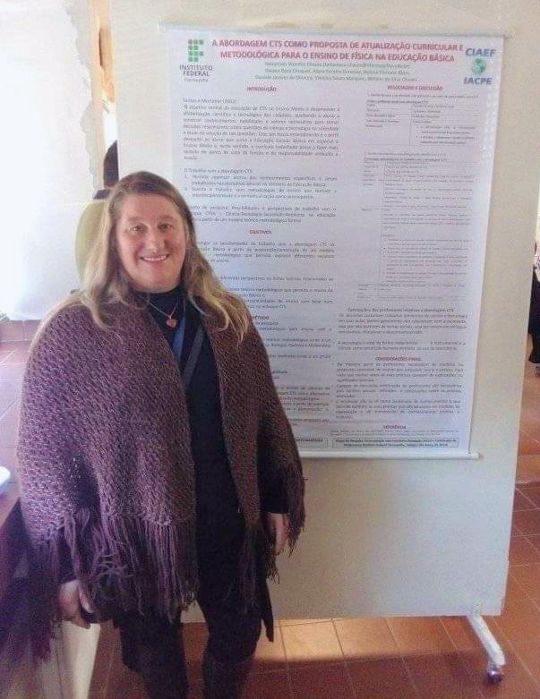 A docente também apresentou um pôster sobre “A abordagem CTS (Ciência, Tecnologia e Sociedade) como proposta de atualização curricular e metodológica para o ensino de física na educação básica”. O trabalho faz parte das atividades desenvolvidas em um de seus projetos de pesquisa em conjunto ao grupo de pesquisa “Emancipação sem Fronteiras – formação inicial e continuada de professores”, certificado pelo IFFar.