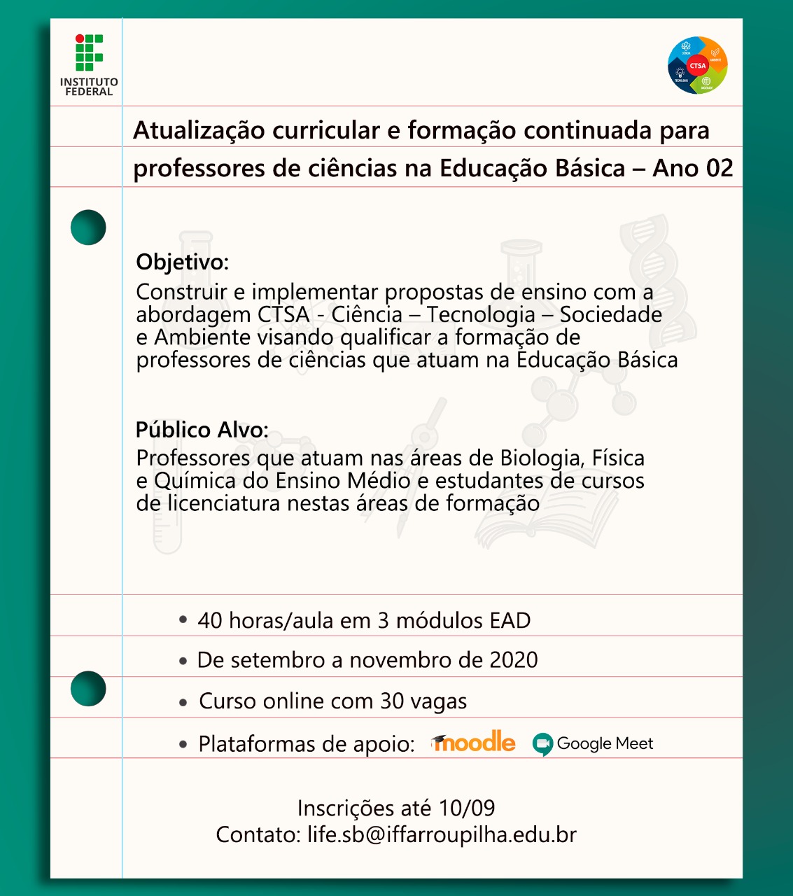 O curso é direcionado a professores de ciências (biologia, física e química) que atuam no ensino médio e também para estudantes de cursos de graduação nestas áreas de formação. O curso de extensão atualização curricular e formação continuada para professores tem por objetivo construir e implementar propostas de ensino com a abordagem CTSA (Ciência, Tecnologia, Sociedade e Ambiente), contribuindo assim para a qualificação e formação de professores de ciências atuantes na educação básica.