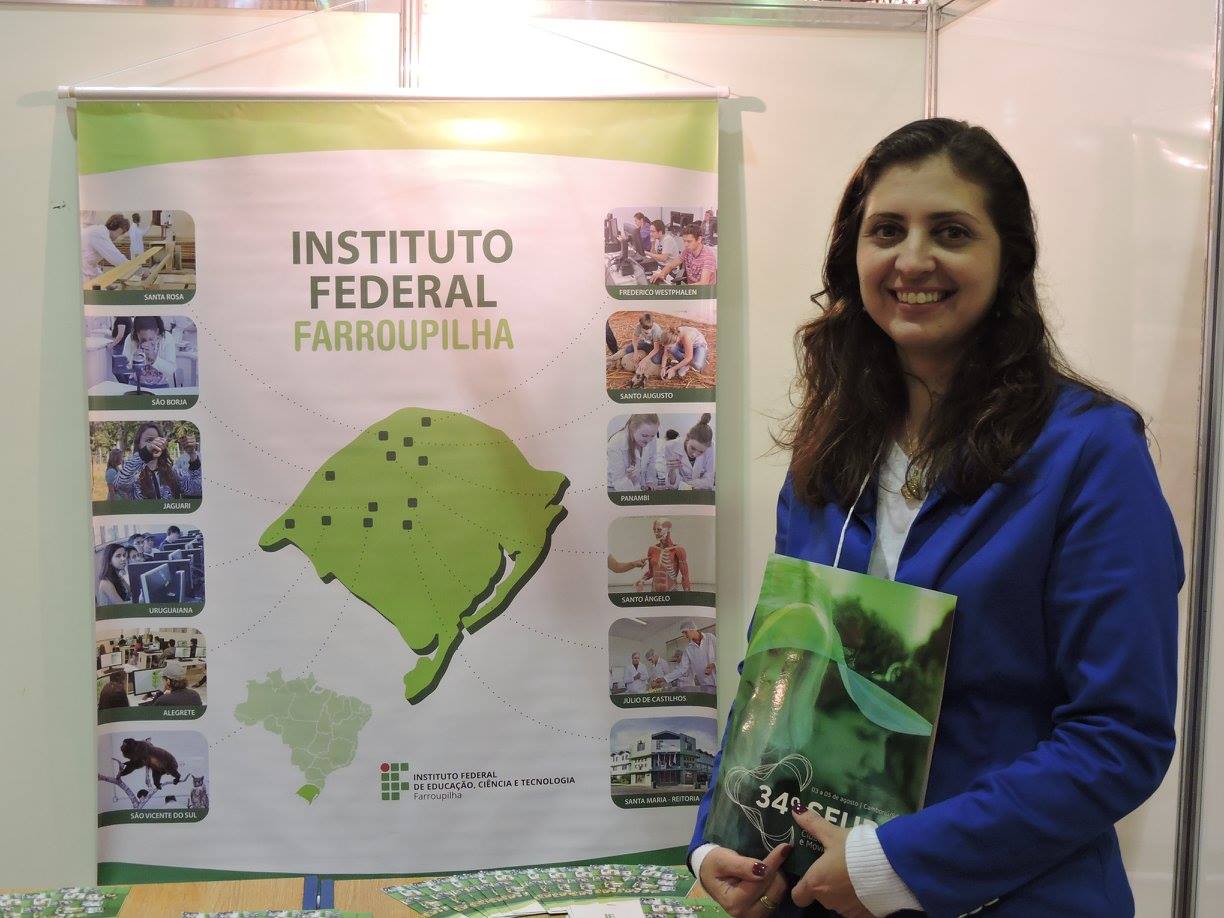 Professora Cristiane Araújo no estande do IF Farroupilha