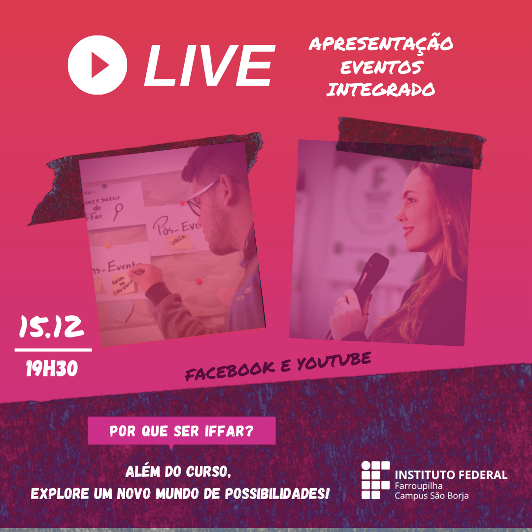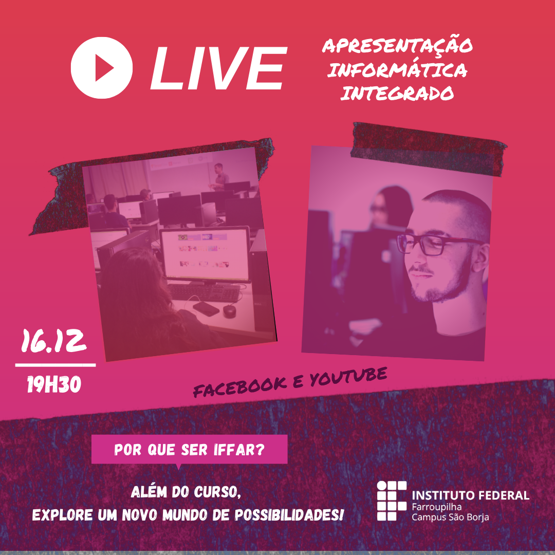 O IFFar – Campus São Borja promove de 15 a 17 de dezembro, a semana de lives de apresentação dos cursos técnicos integrados ao ensino médio, Técnico em Informática e Técnico em Eventos.