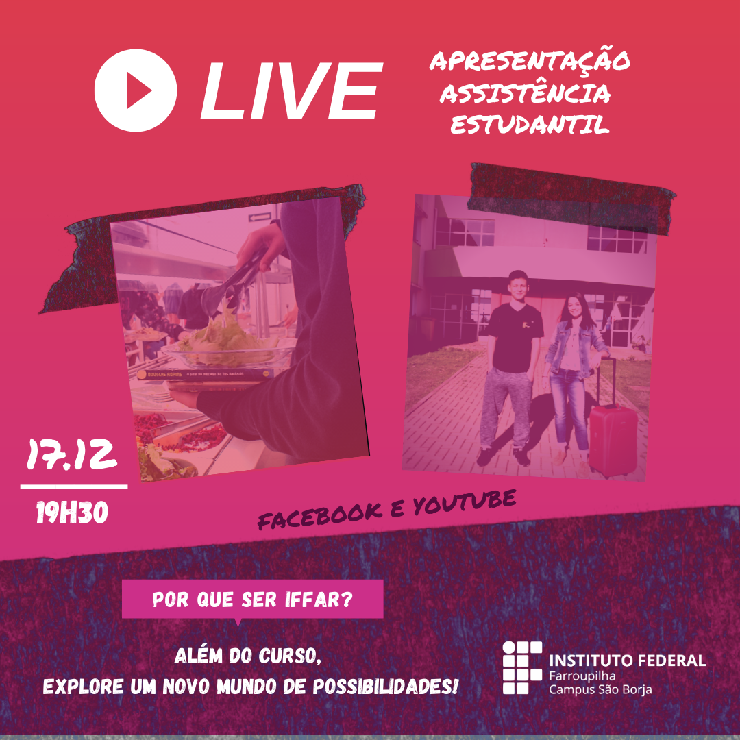 Além da live específica dos cursos, haverá uma live exclusiva sobre a política de Assistência Estudantil do IFFar. Nesse dia serão discutidos temas como acesso à moradia estudantil para alunos de outras cidades ou do interior do município, alimentação durante o dia (uma vez que o curso é realizado em período integral - manhã e tarde) além de outros benefícios estudantis como auxílios financeiros para transporte e auxílio permanência, destinados a estudantes em situação de vulnerabilidade socioeconômica.