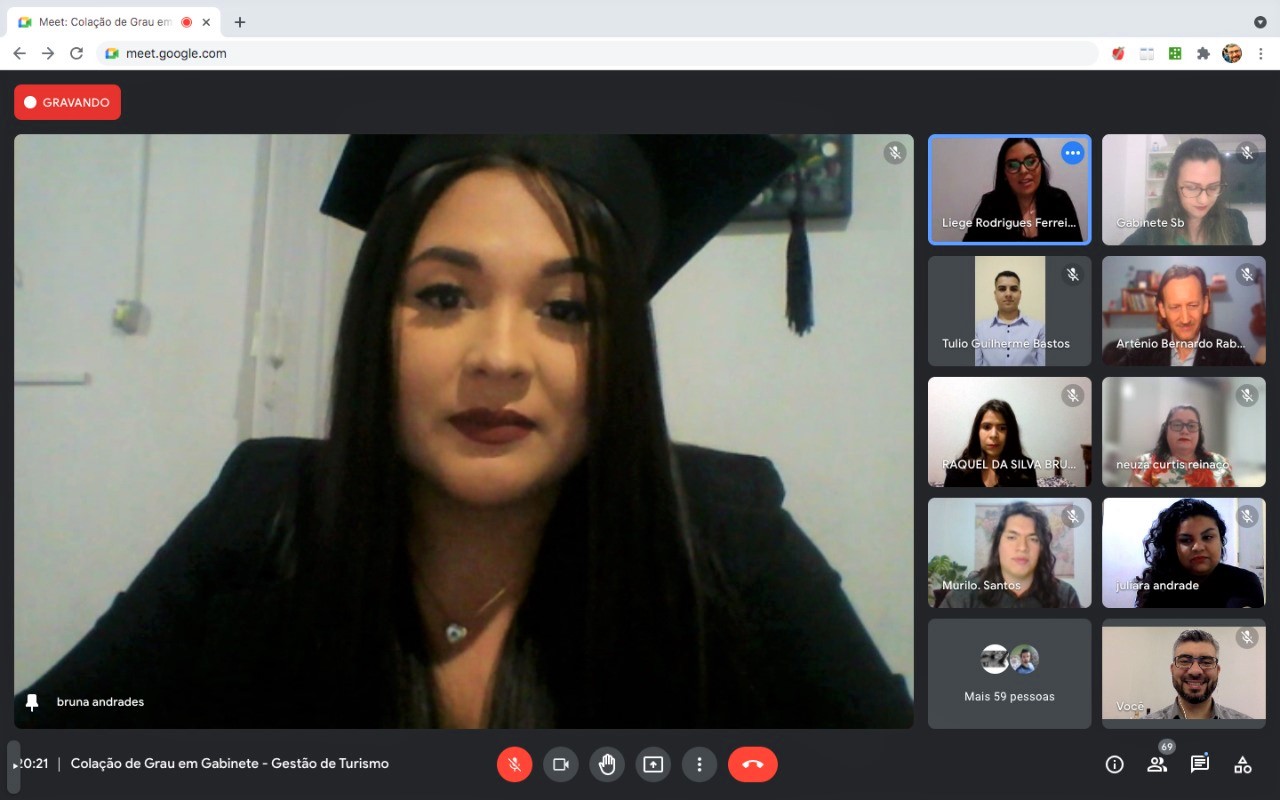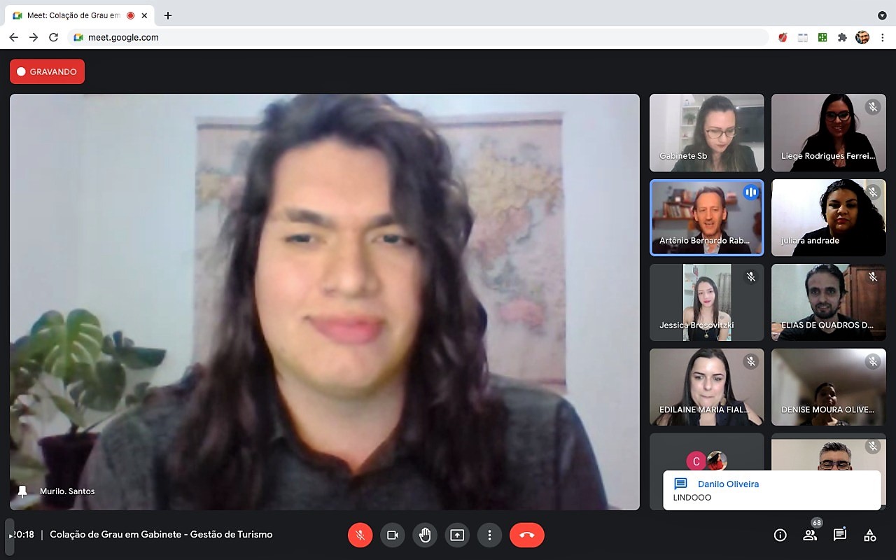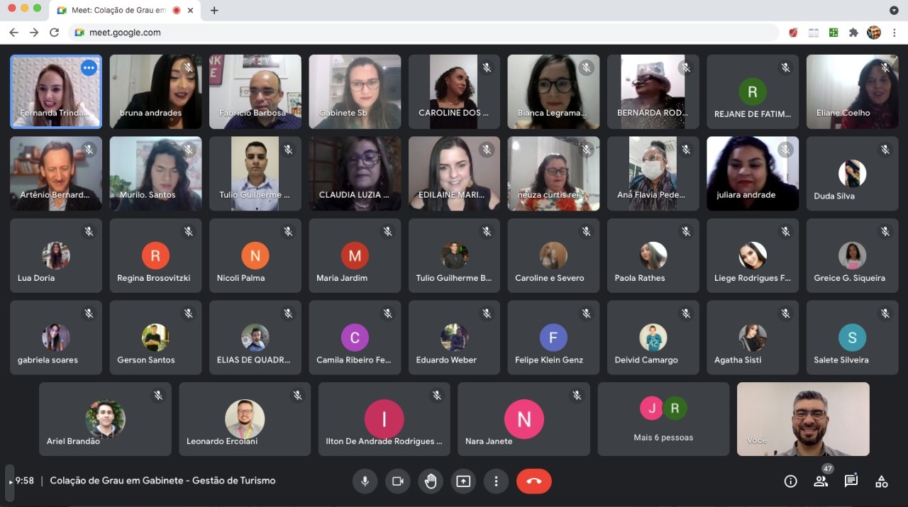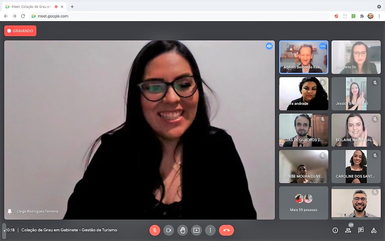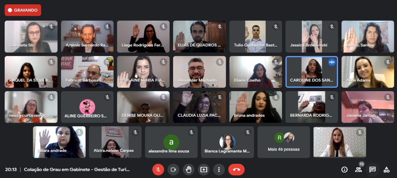 14 alunos formandos do curso, turma de ingresso 2019 e demais concluintes que aguardavam colação de grau, foram diplomados Tecnológos em Gestão de Turismo, em cerimônia virtual de colação de grau com a presença de autoridades acadêmicas, professores do curso, homenageados, alunos formandos e familiares.
