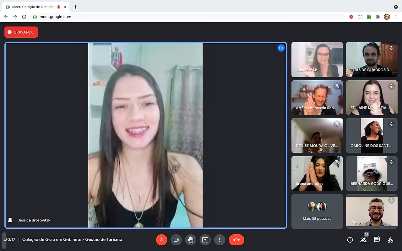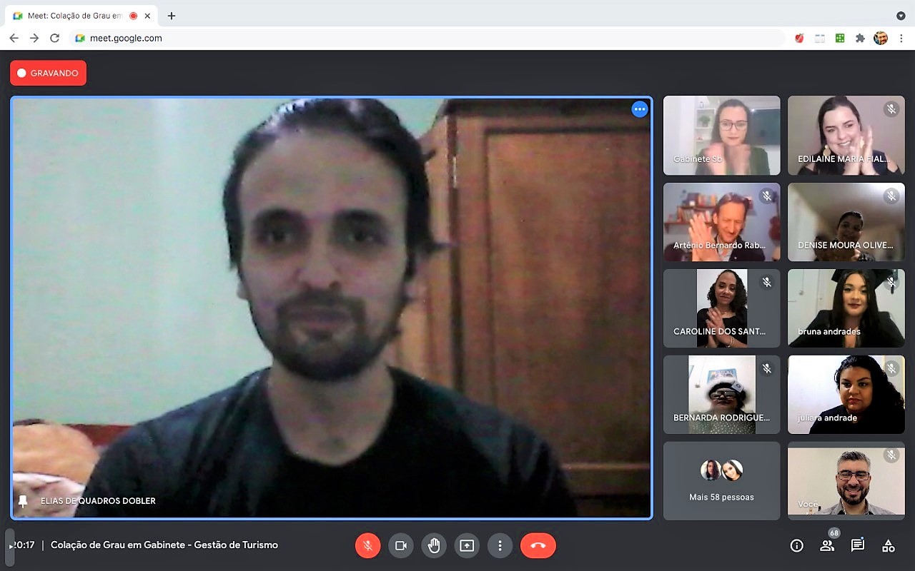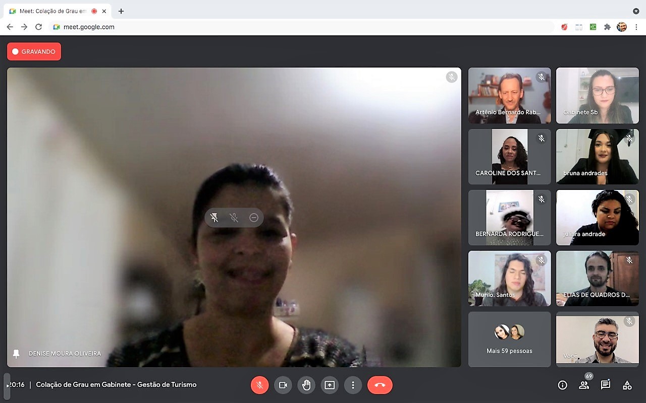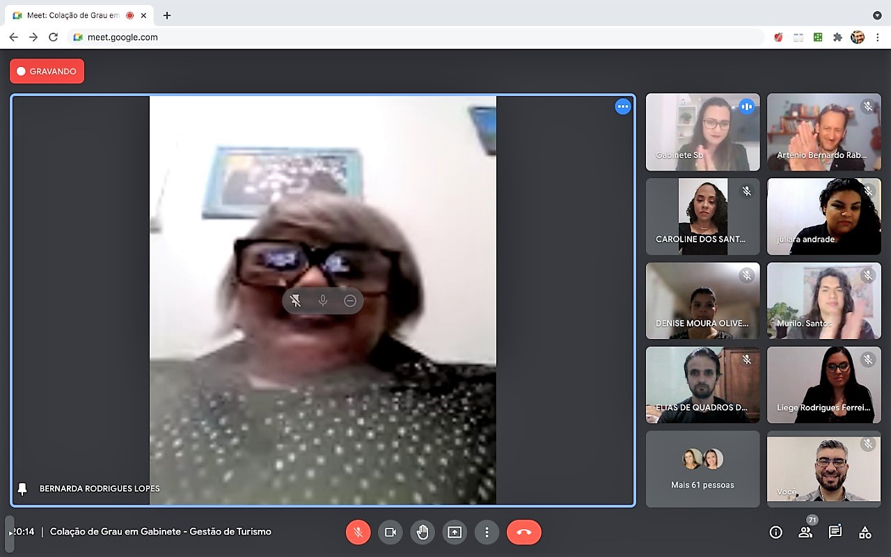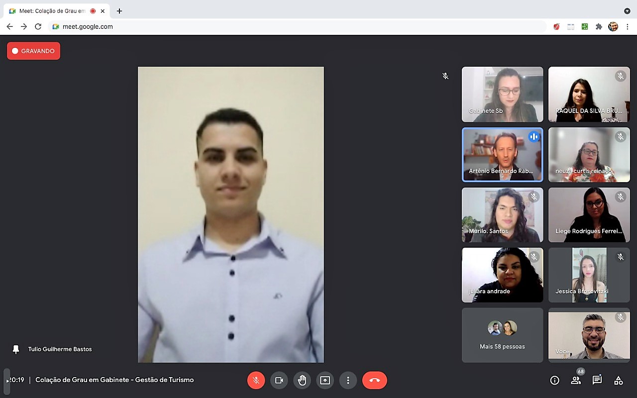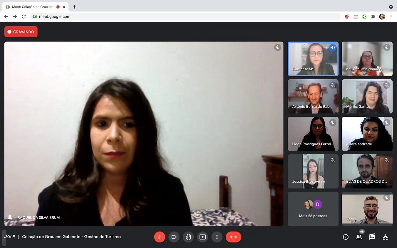 14 alunos formandos do curso, turma de ingresso 2019 e demais concluintes que aguardavam colação de grau, foram diplomados Tecnológos em Gestão de Turismo, em cerimônia virtual de colação de grau com a presença de autoridades acadêmicas, professores do curso, homenageados, alunos formandos e familiares.
