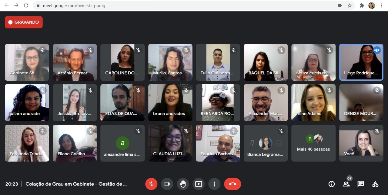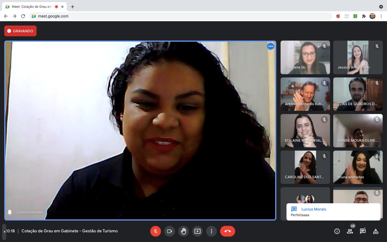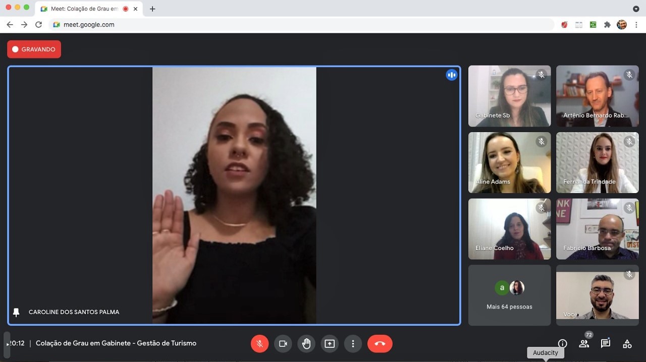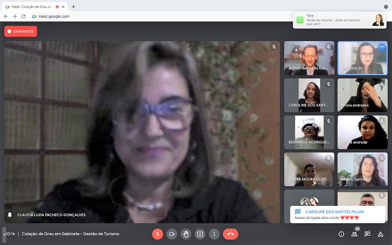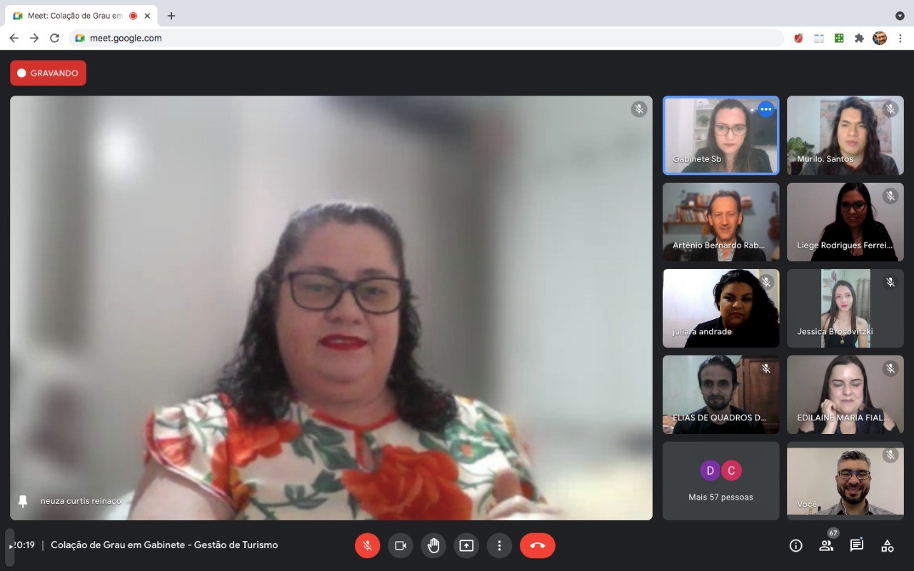 14 alunos formandos do curso, turma de ingresso 2019 e demais concluintes que aguardavam colação de grau, foram diplomados Tecnológos em Gestão de Turismo, em cerimônia virtual de colação de grau com a presença de autoridades acadêmicas, professores do curso, homenageados, alunos formandos e familiares.