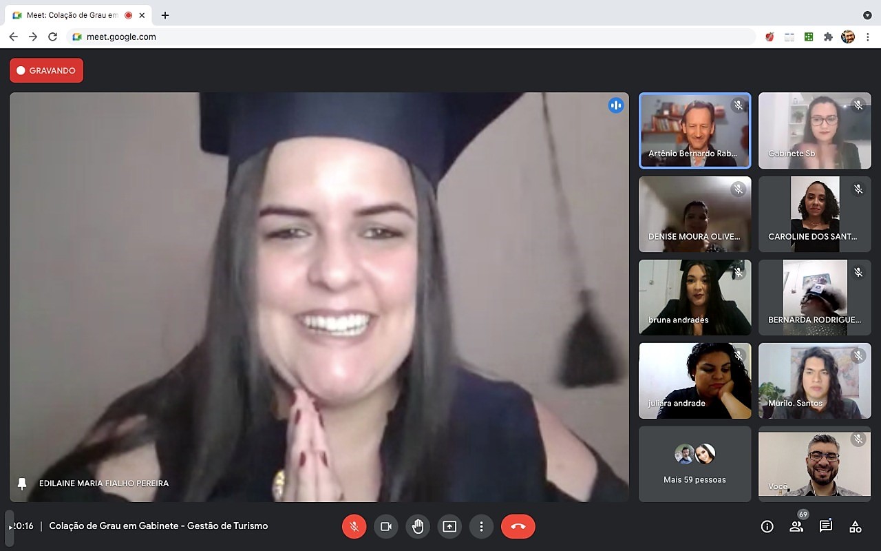 Tela da Solenidade de Colação de Grau Virtual com formando e professores