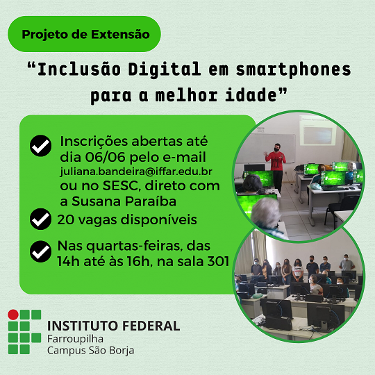 O projeto de extensão "Inclusão digital em smartphones para melhor idade", iniciado no dia 25/05 (quarta-feira), ocorre durante as quartas-feiras, das 14h às 16h, na sala 301 do IFFar-Campus São Borja. Ainda é possivel se inscrever no projeto até esta segunda-feira (06), de forma online, através do envio de e-mail para Este endereço de email está sendo protegido de spambots. Você precisa do JavaScript ativado para vê-lo., devendo conter o nome completo e CPF do candidato ou candidata.