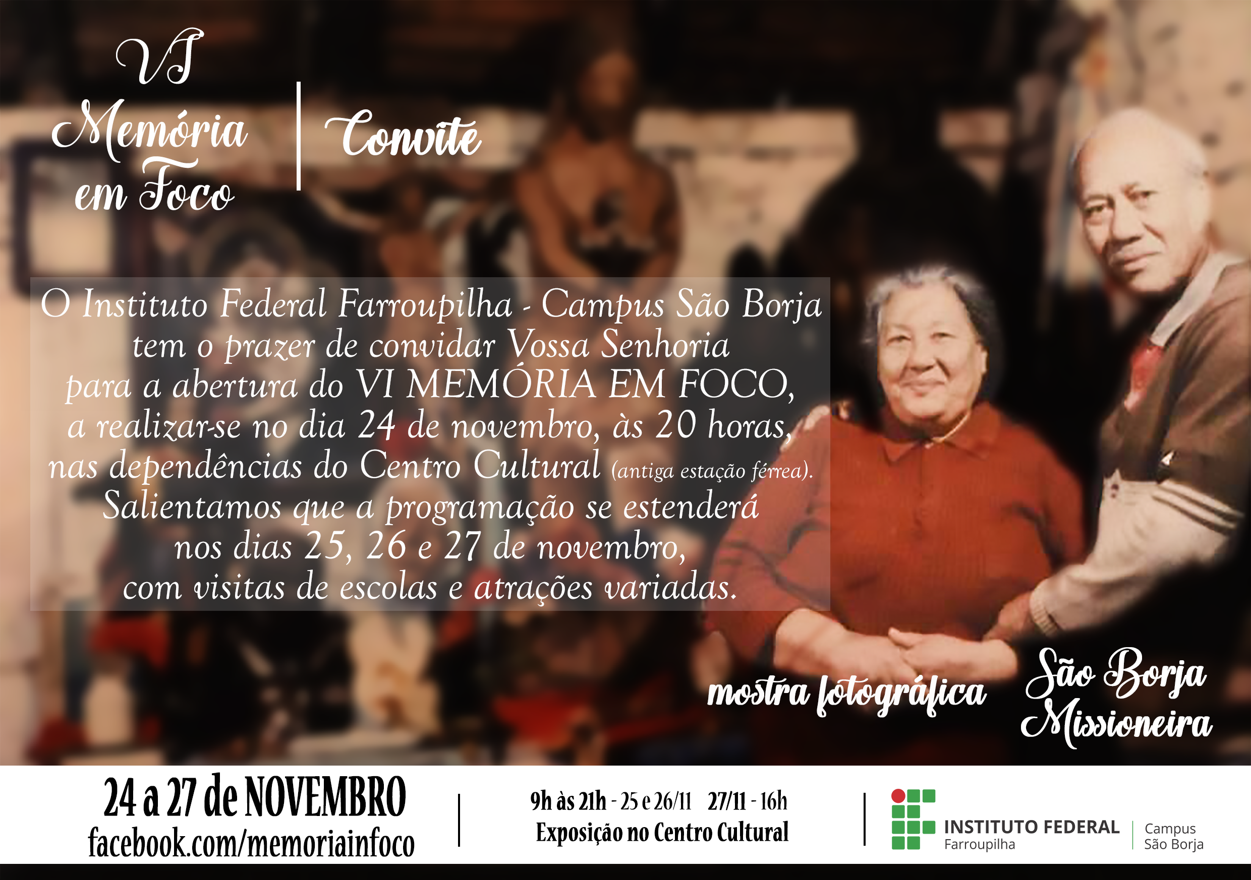 A VI edição da Mostra Fotográfica Memória em Foco, promovida anualmente pelo Instituto Federal Farroupilha - Campus São Borja e este ano com apoio do Centro Cultural de São Borja, ocorre de 24 a 27 deste mês, na Estação Férrea, atual Centro Cultural.