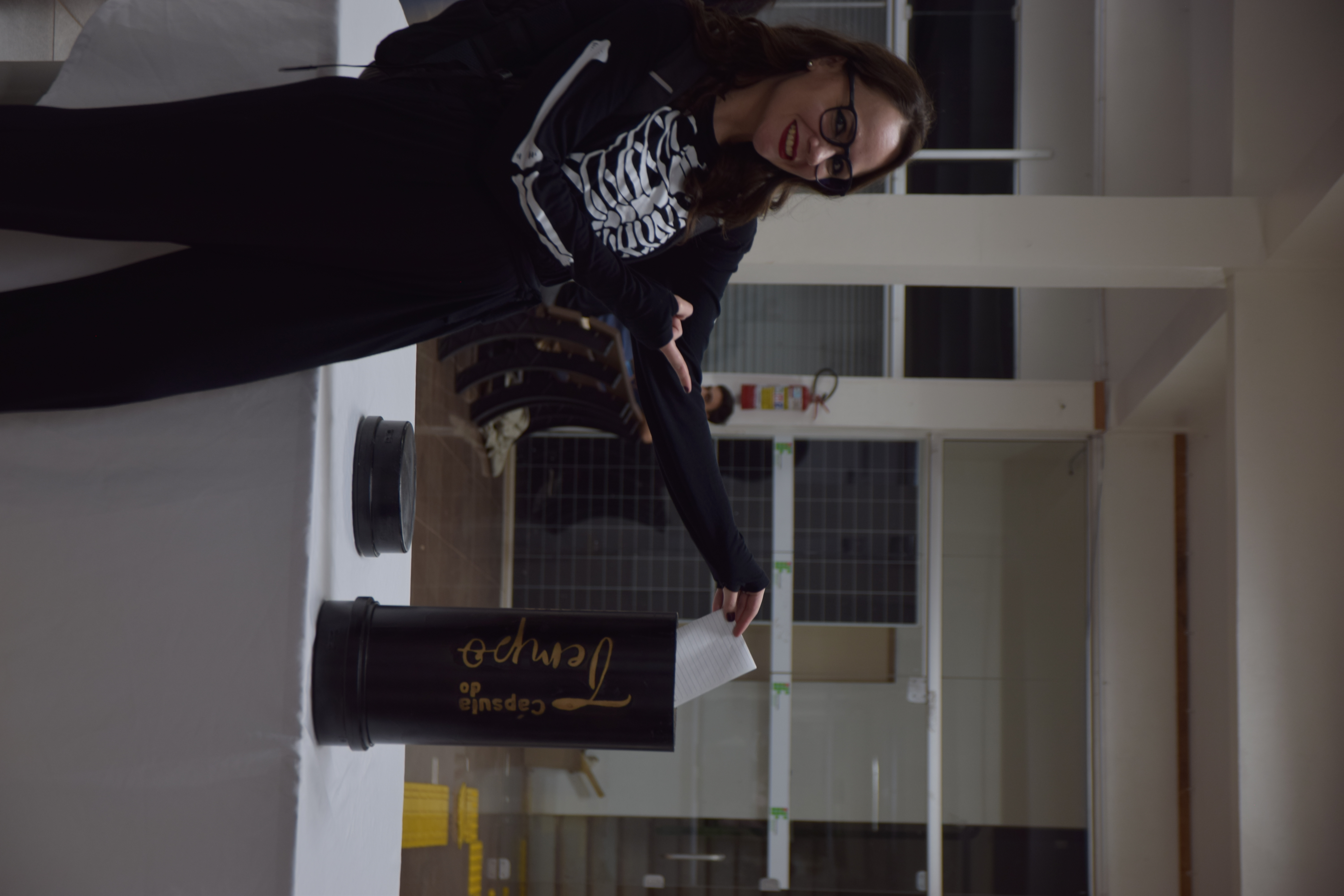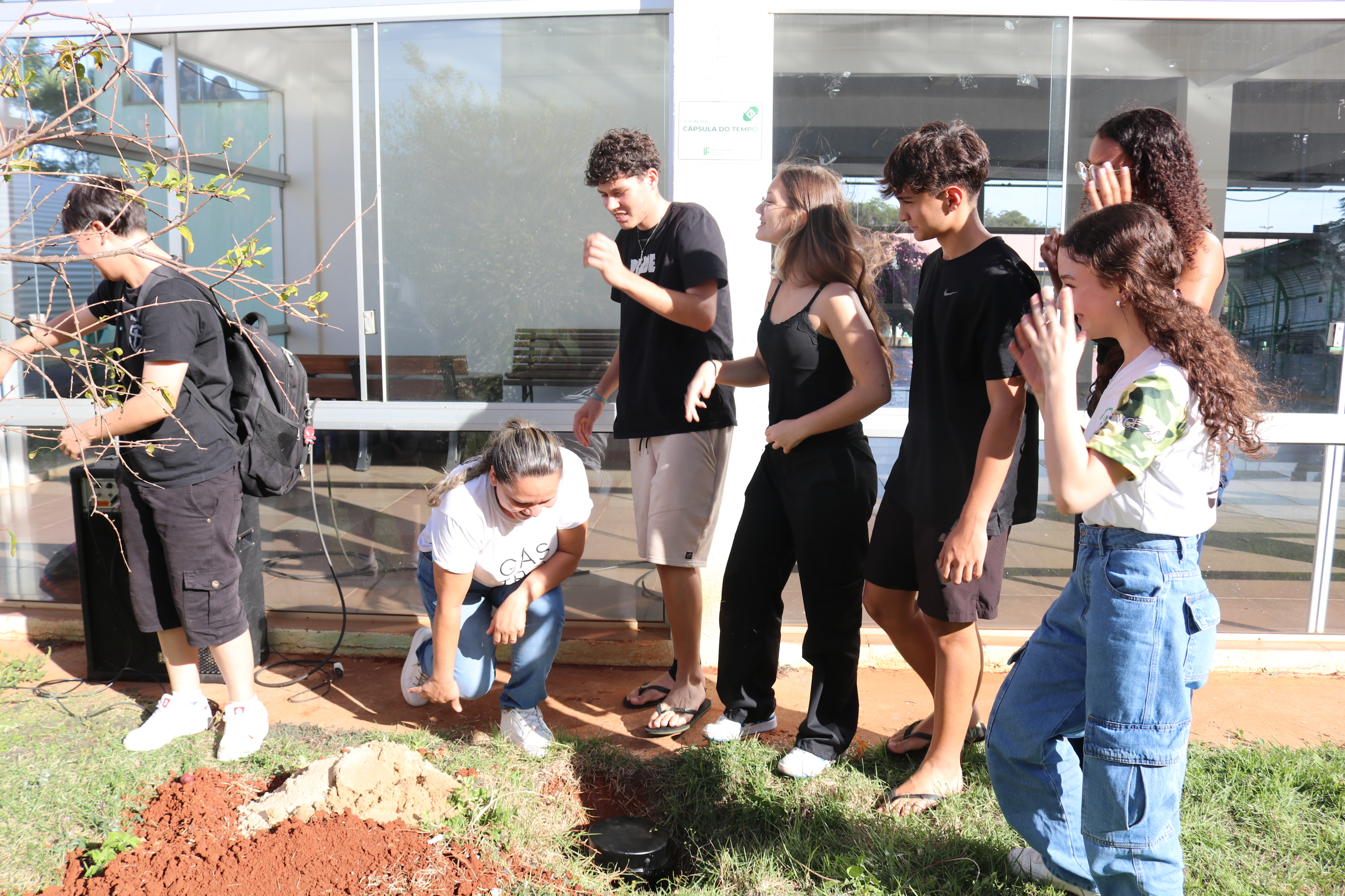 Foto: Larissa e seu namorado depositam uma lembrança na cápsula do tempo/ASCOM