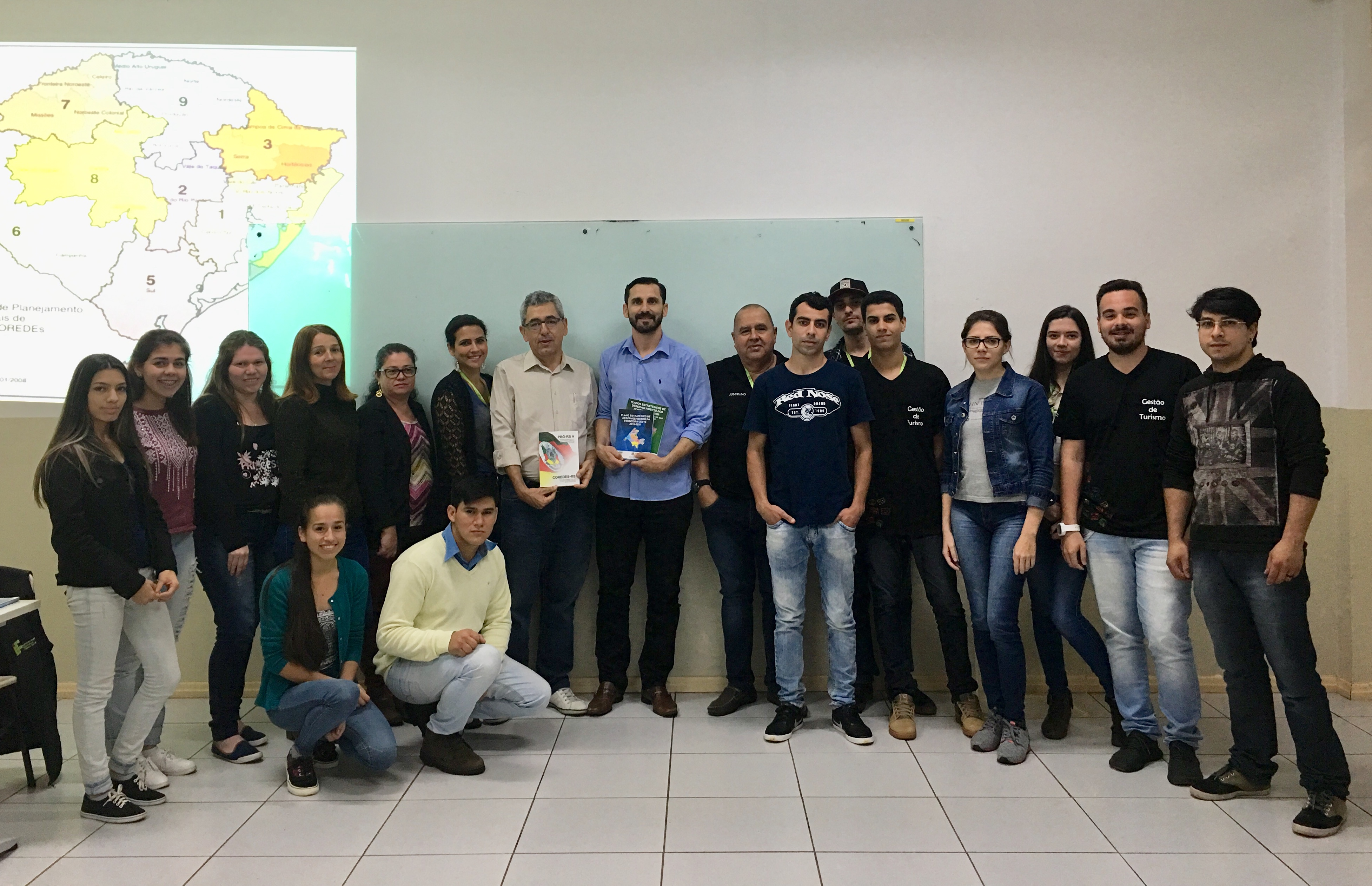 Na última quarta-feira (25), as turmas do 2º e 4º semestres do Curso de Tecnologia em Gestão de Turismo, participaram de uma palestra com o Presidente do Corede da Fronteira Oeste, Tesoureiro do Fórum Estadual dos Coredes e Presidente do Sindicato dos Trabalhadores nas Indústrias da Alimentação de São Borja, Hugo Marques Chimenes.