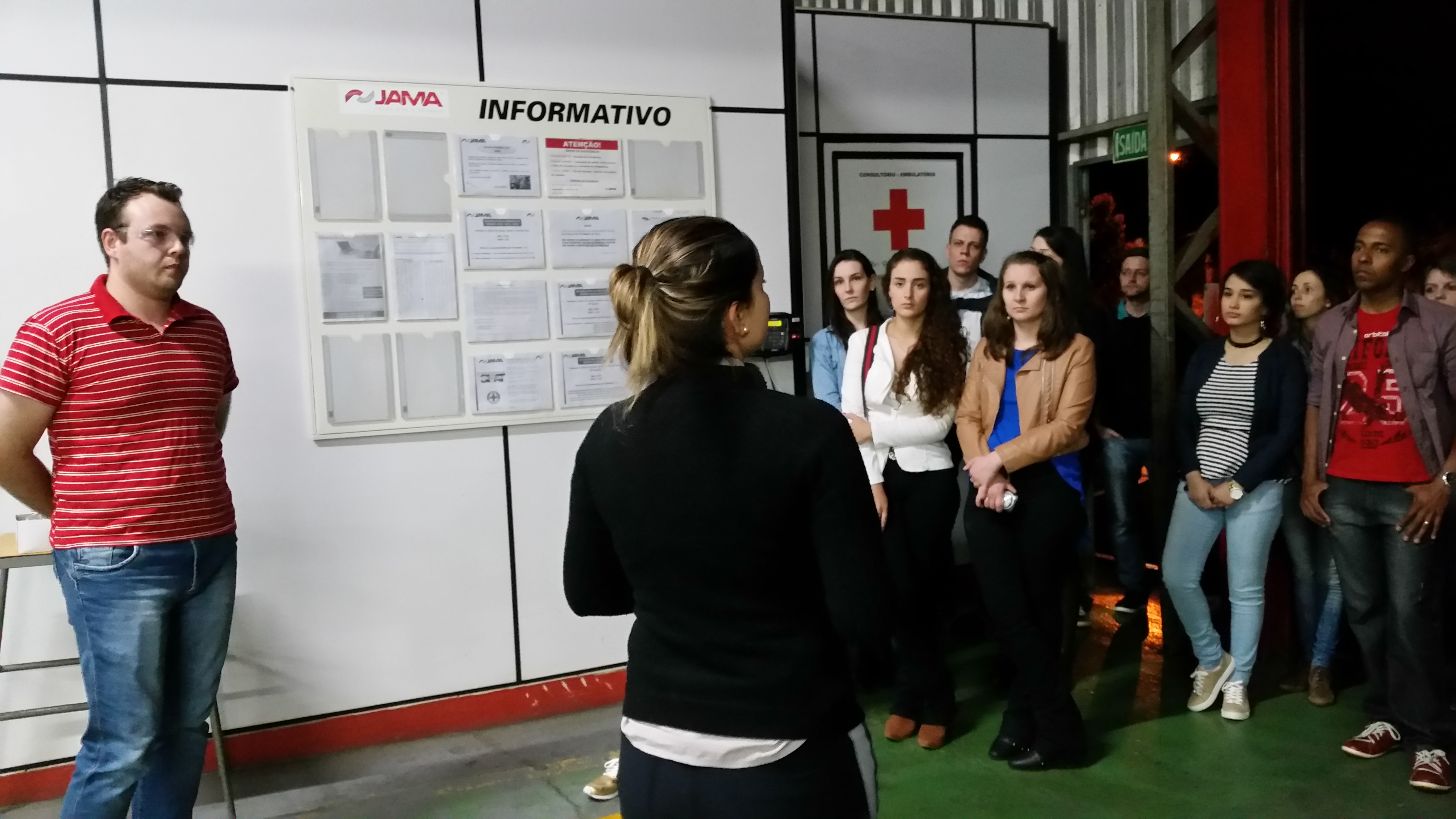 Na sexta-feira ( 07) os acadêmicos do 8º semestre do curso bacharelado em Administração do IFFar - Campus Santa Rosa realizaram uma visita técnica à indústria Metalúrgica Jama Ltda, situada no distrito industrial de Santa Rosa. A visita possibilitou aos alunos conhecerem uma indústria e seus processos, bem como visualizar, na prática, os conceitos e ferramentas aplicadas na gestão da qualidade. A professora Rosmere Gregory da Rosa, docente da disciplina de Gestão da Qualidade, acompanhou os alunos. Os acadêmicos foram recebidos pela Sra. Arieli (RH), pelo técnico de segurança do trabalho, pelo supervisor de produção do turno da noite e também pelo supervisor da qualidade.