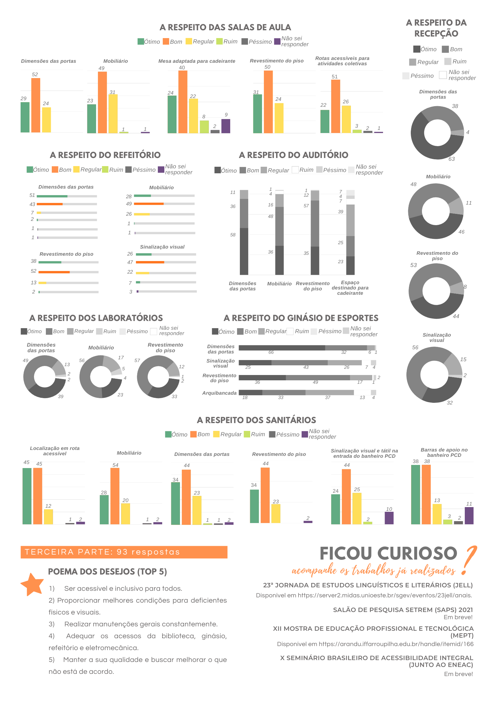 Em suma, através do método aplicado, identificam-se as necessidades físicas e também percepções dos usuários, dando voz a quem nem sempre é incluído nas produções arquitetônicas e verificando se a real finalidade de uma edificação pública educacional está sendo cumprida, isto é, não apenas construir abrigo, mas abrigar integralmente todas as pessoas, independente das suas demandas. O material com os resultados está disponível em anexo.