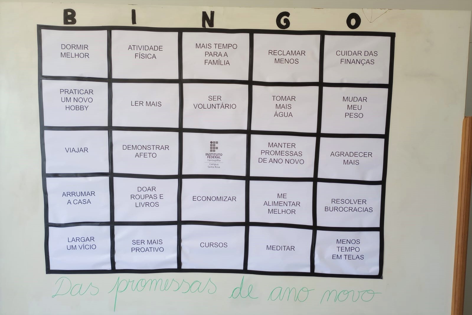 Como elemento decorativo, a Comissão de Qualidade de Vida elaborou um Bingo das famosas resoluções de Ano Novo, com sugestões de algo que poderia ser feito para melhorar a vida pessoal de cada um e salientar a importância do planejamento para o alcance de metas.