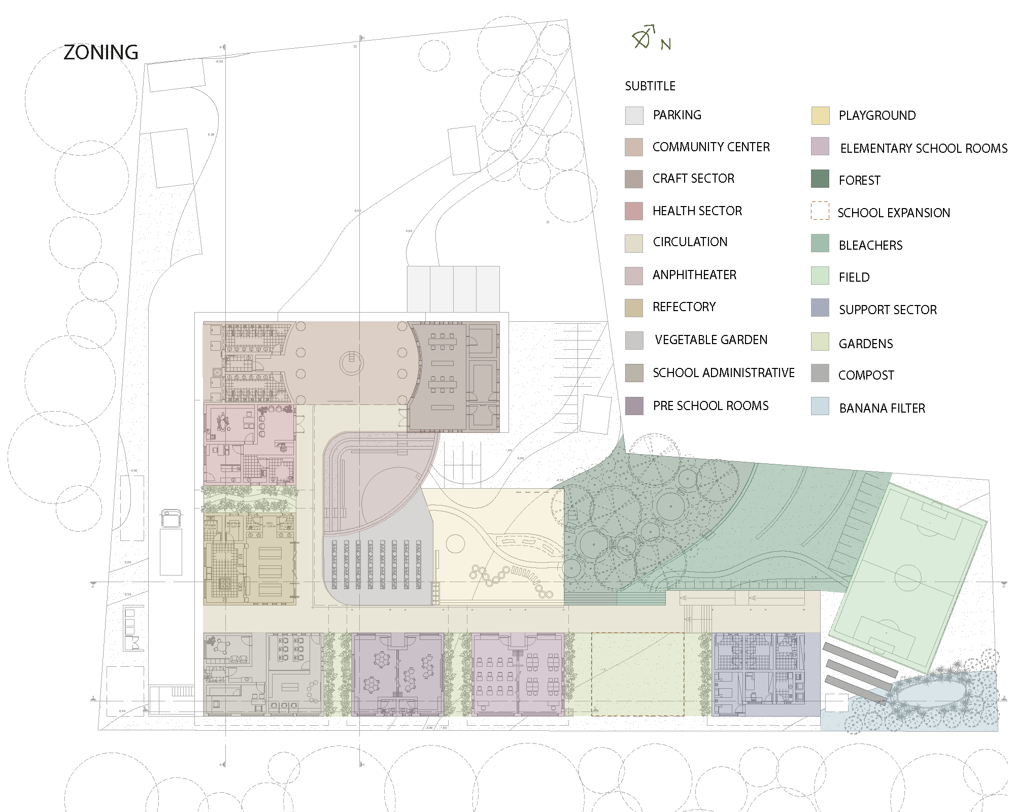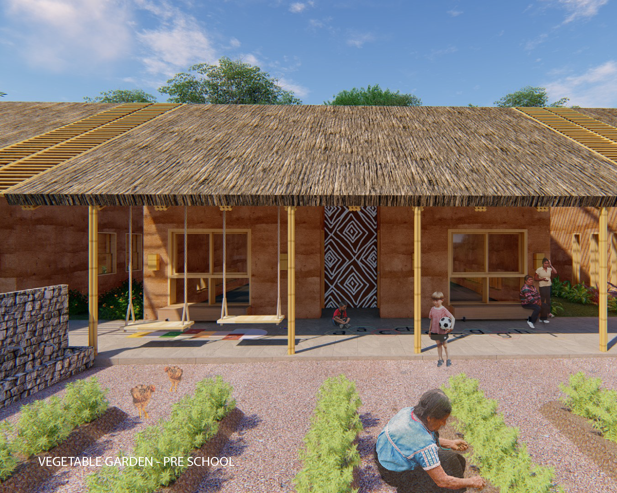 O trabalho exigiu um estudo aprofundado sobre a etnia, para uma proposta alinhada aos seus costumes e práticas. O respeito à cultura indígena aparece da escolha dos materiais às técnicas de construção. "Todos os edifícios propostos possuem materialidades presentes no local e que já fazem parte da cultura construtiva da comunidade, como o barro, a palha e a taquara. Isso não só reduz os custos, como também gera um senso de pertencimento em todos os envolvidos". Outro fator decisivo foi priorizar um método no qual a comunidade pudesse participar da construção de todos os blocos propostos. "Por isso a técnica construtiva adotada foi a taipa de pilão".