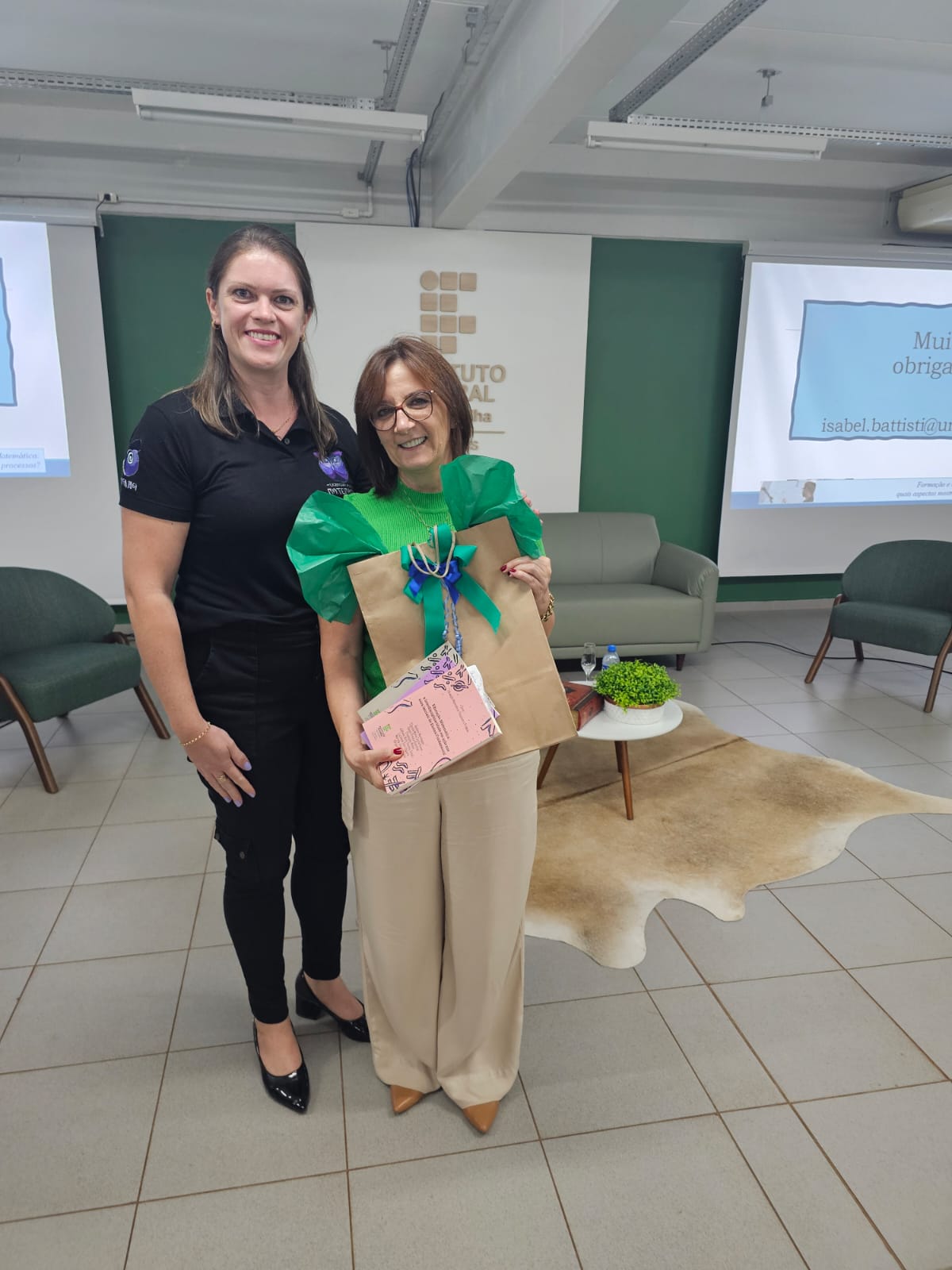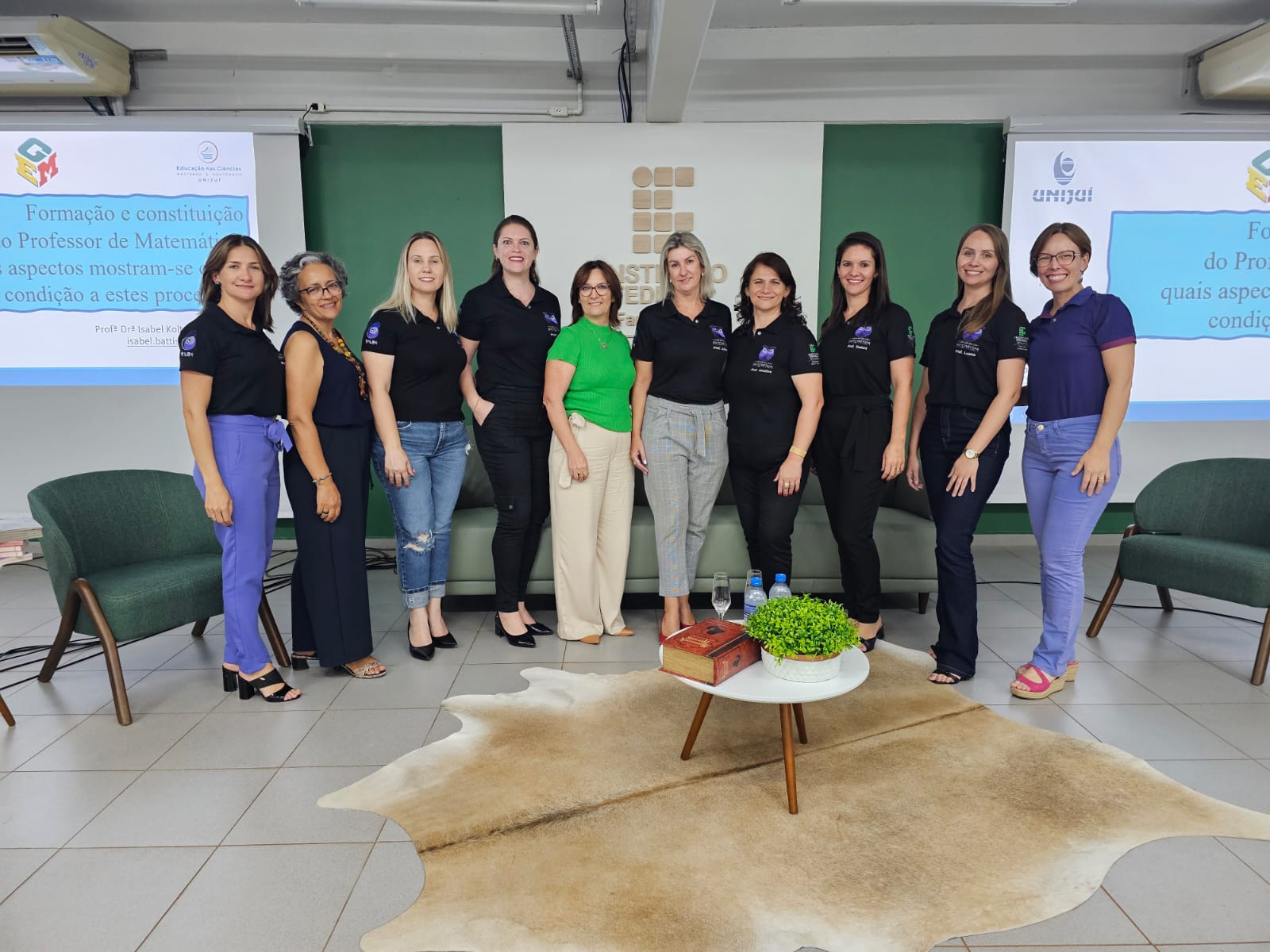 Posteriormente foram instigadas reflexões mediante a palestra da Professora Dra. Isabel Koltermann Battisti, da Universidade Regional do Noroeste do Estado do Rio Grande do Sul (UNIJUÍ), intitulada “Formação e constituição do Professor de Matemática: quais aspectos mostram-se como condição a estes processos?”, a qual trouxe para discussão o processo de ensinar e aprender Matemática nos atuais e diferentes contextos escolares.