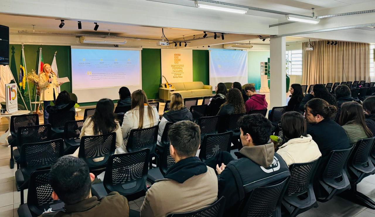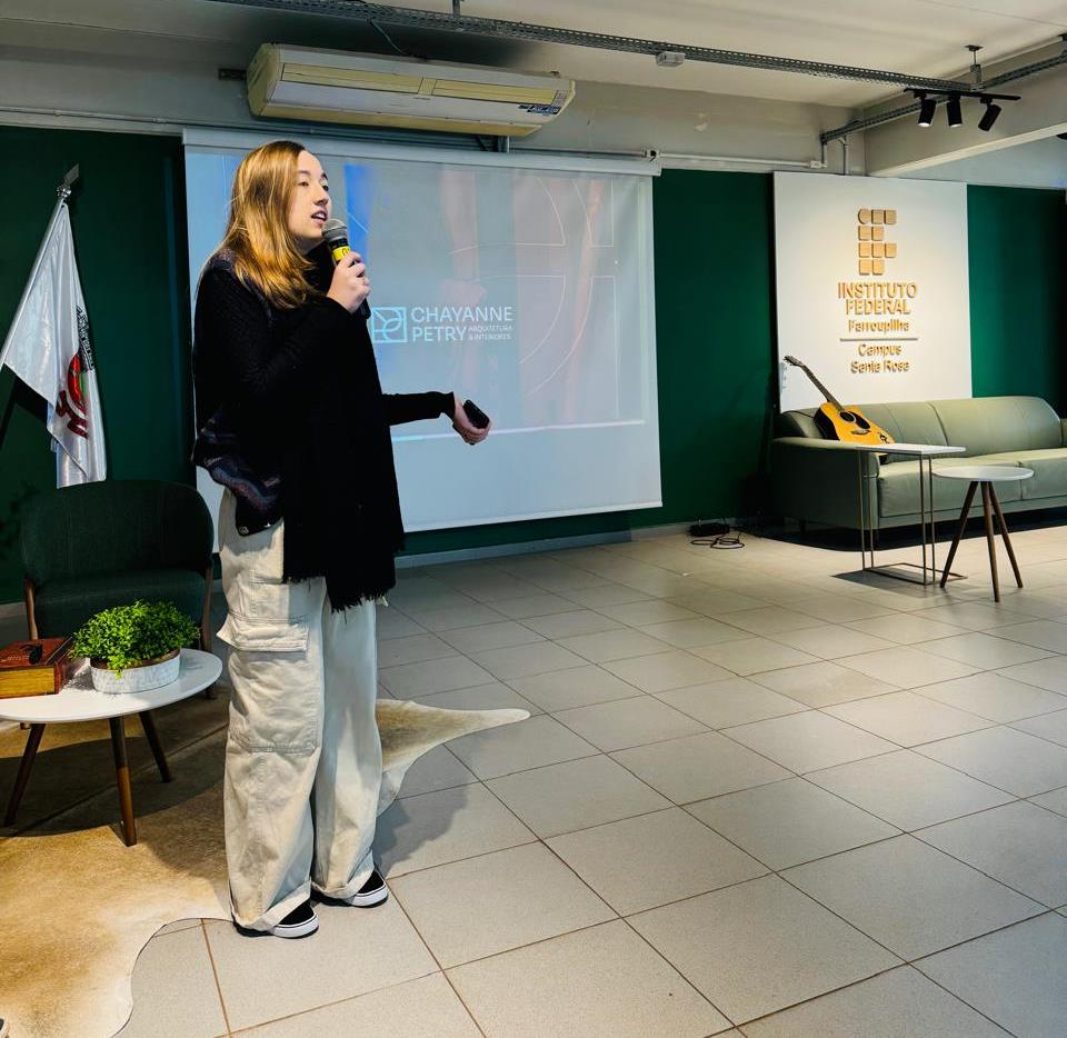 Na manhã do dia 01 de julho de 2024, foi realizada a aula inaugural do Curso de Arquitetura e Urbanismo do IFFar Campus Santa Rosa, com o tema "A importância de transmitir sua identidade em cada projeto". A palestra foi proferida pela arquiteta e urbanista Chayanne Petry. A convidada contou um pouco sobre sua trajetória acadêmica e profissional e abordou aspectos relevantes para o mercado de trabalho. O evento foi organizado pelo Diretório Acadêmico do Curso de Arquitetura e Urbanismo (DACAU) e ocorreu no auditório do campus, contando com a presença de professores e acadêmicos de diversos semestres do curso.