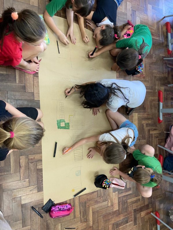 Após estudos teóricos, diagnósticos urbanos e análise de condicionantes legais, os acadêmicos realizaram atividades de campo com uma turma do 3º ano do Ensino Fundamental. A programação incluiu uma conversa inicial sobre a cidade, a produção de desenhos a partir das percepções das crianças sobre o espaço urbano e uma caminhada orientada pelo entorno da escola, organizada em grupos temáticos.