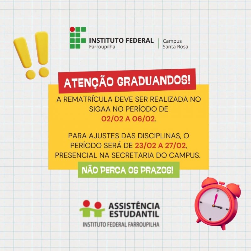 A Rematrícula 2026 deve ser realizada no SIGAA entre os dias 02/02/2026 a 06/02/2026.