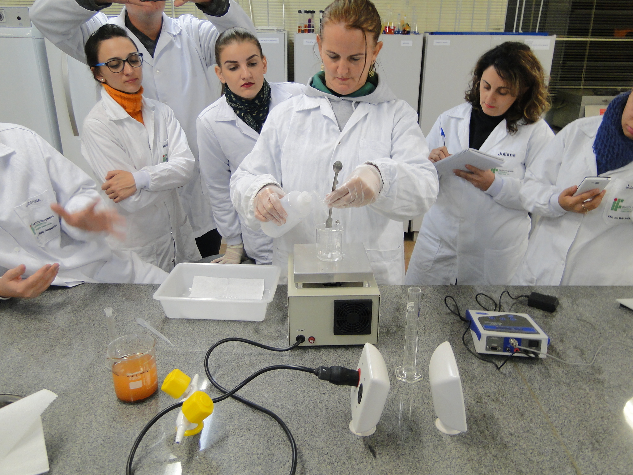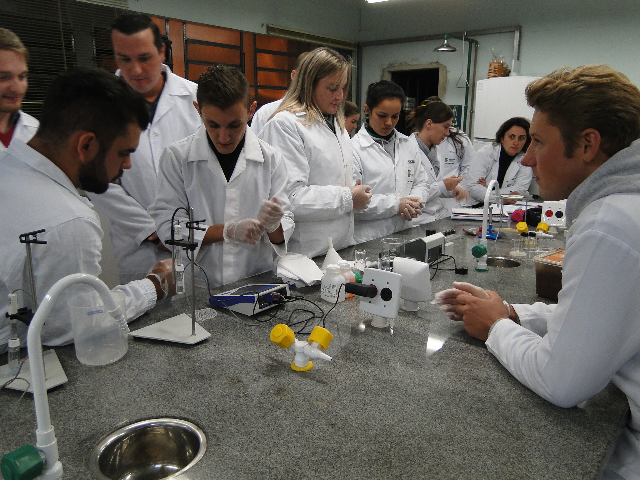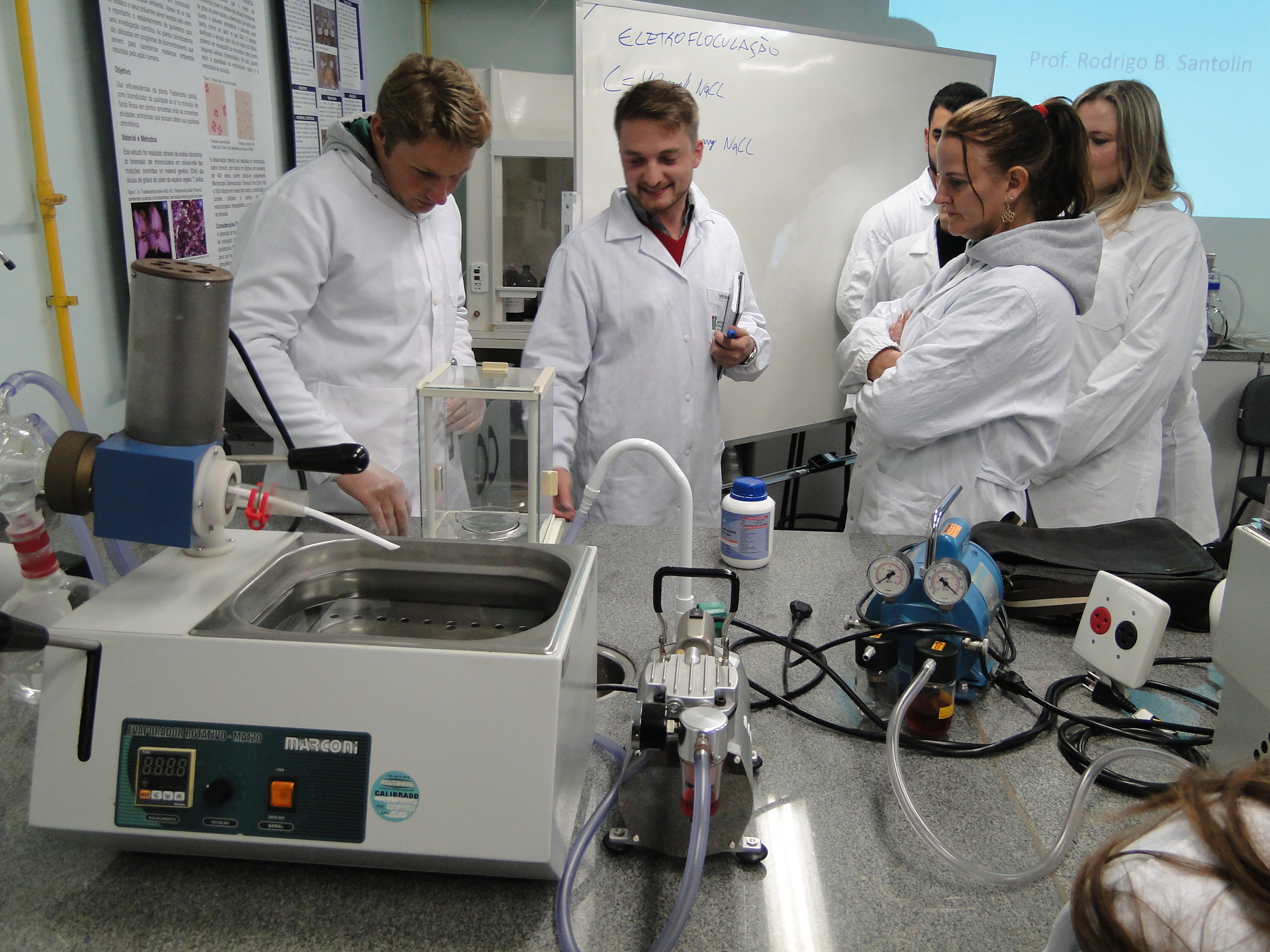 Os alunos foram recepcionados pela professora Vera Klajn, coordenadora do curso EAD, e em seguida, participaram de atividades práticas nos Laboratórios de Química e Meio Ambiente junto aos alunos do 3° semestre do curso presencial. O professor Rodrigo Santolin foi quem ministrou as atividades nos laboratórios, onde foram realizadas as seguintes atividades: preparo de soluções; construção de um protótipo para tratamento de efluentes industriais por eletro floculação; medição da eficiência do protótipo construído através da verificação por parâmetros: turbidez, pH e sólidos suspensos; construção de um sistema domiciliar de vermicompostagem com enfoque na transformação de resíduos orgânicos em húmus e a visita ao laboratório de biologia para apresentação de protótipos de sistemas de tratamento de efluentes sanitários – estes confeccionados pelos alunos presenciais do curso.