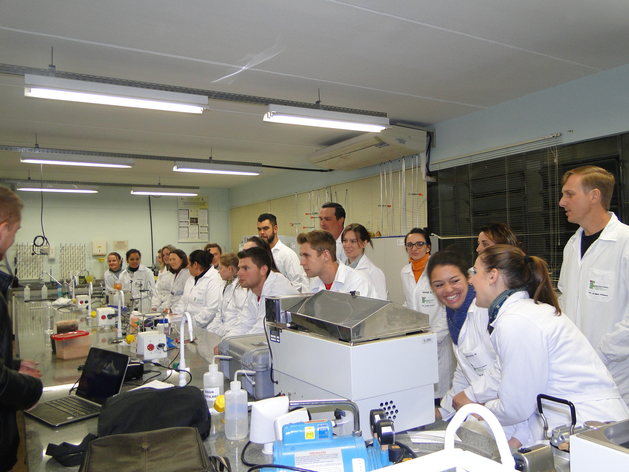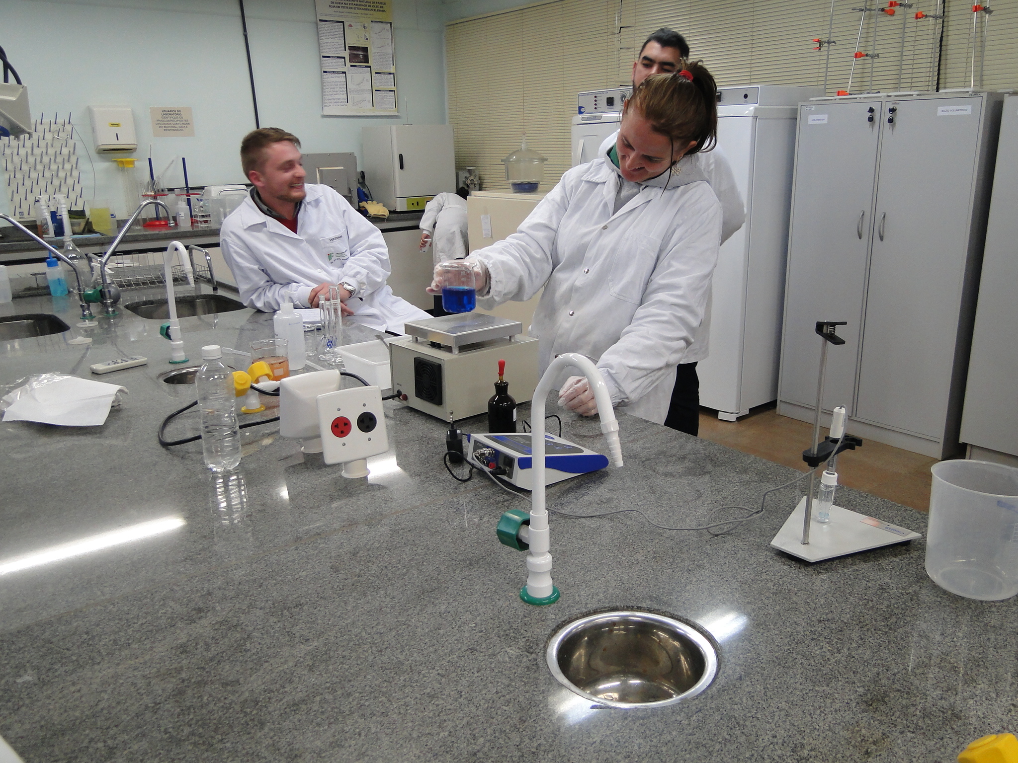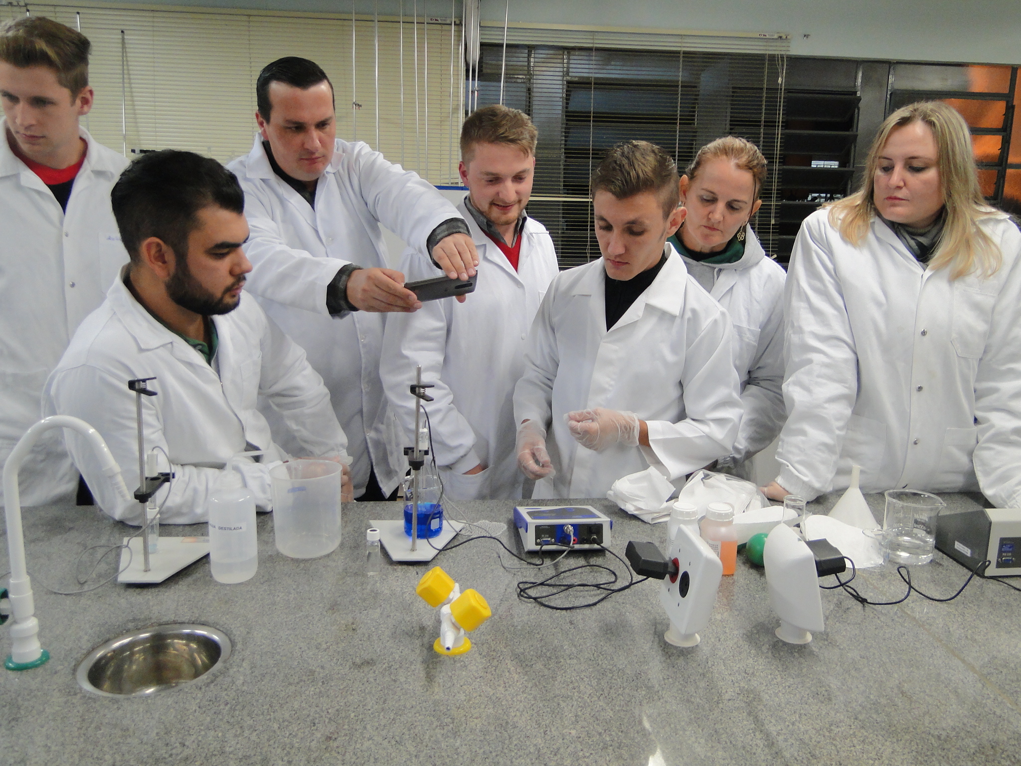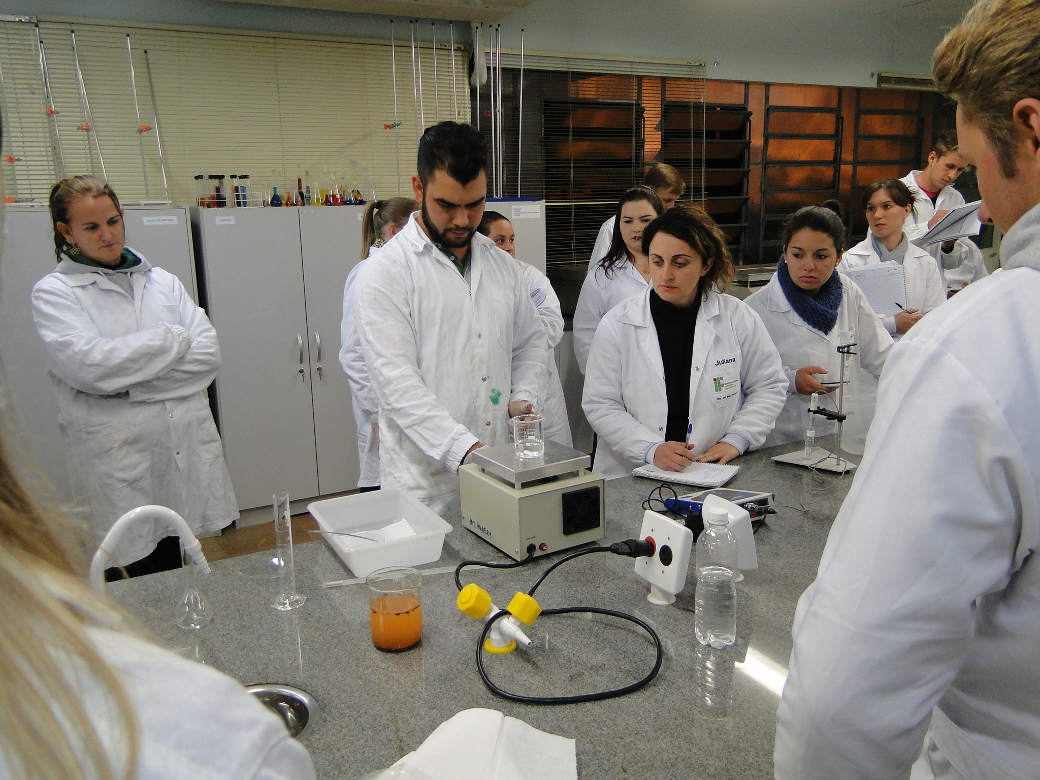 Os alunos foram recepcionados pela professora Vera Klajn, coordenadora do curso EAD, e em seguida, participaram de atividades práticas nos Laboratórios de Química e Meio Ambiente junto aos alunos do 3° semestre do curso presencial. O professor Rodrigo Santolin foi quem ministrou as atividades nos laboratórios, onde foram realizadas as seguintes atividades: preparo de soluções; construção de um protótipo para tratamento de efluentes industriais por eletro floculação; medição da eficiência do protótipo construído através da verificação por parâmetros: turbidez, pH e sólidos suspensos; construção de um sistema domiciliar de vermicompostagem com enfoque na transformação de resíduos orgânicos em húmus e a visita ao laboratório de biologia para apresentação de protótipos de sistemas de tratamento de efluentes sanitários – estes confeccionados pelos alunos presenciais do curso.