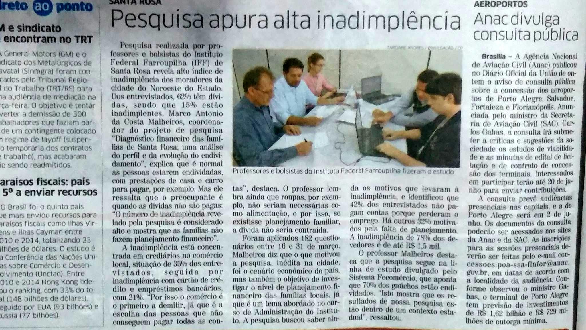 Pesquisa realizada por professores e alunos do campus foi notícia do Jornal Correio do Povo no último sábado (07). A investigação intitulada "Diagnóstico financeiro das famílias de Santa Rosa: uma análise do perfil e da evolução do endividamento" tem o objetivo de fazer um levantamento da evolução do endividamento e da inadimplência das famílias no município de Santa Rosa diante das incertezas do cenário econômico brasileiro.