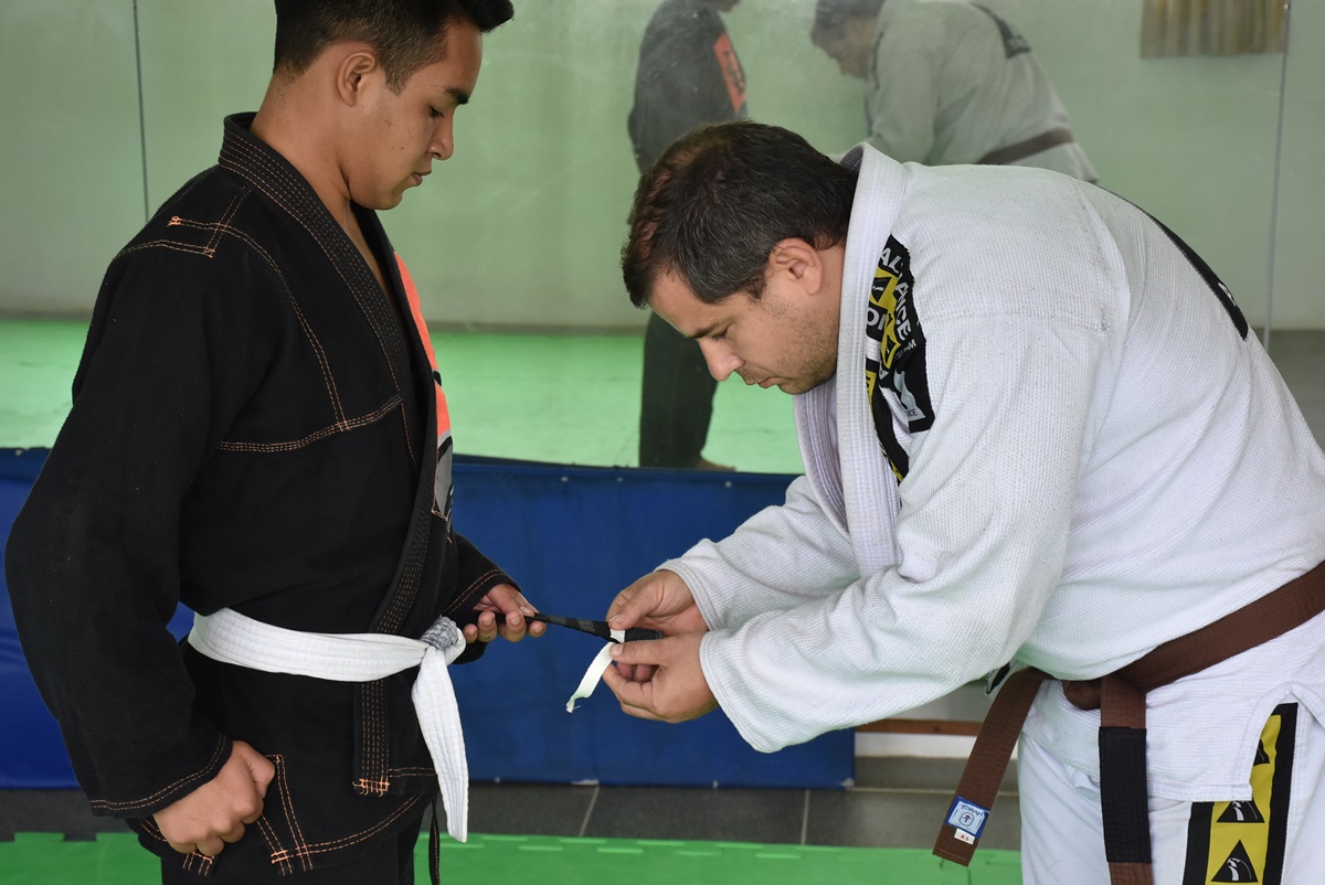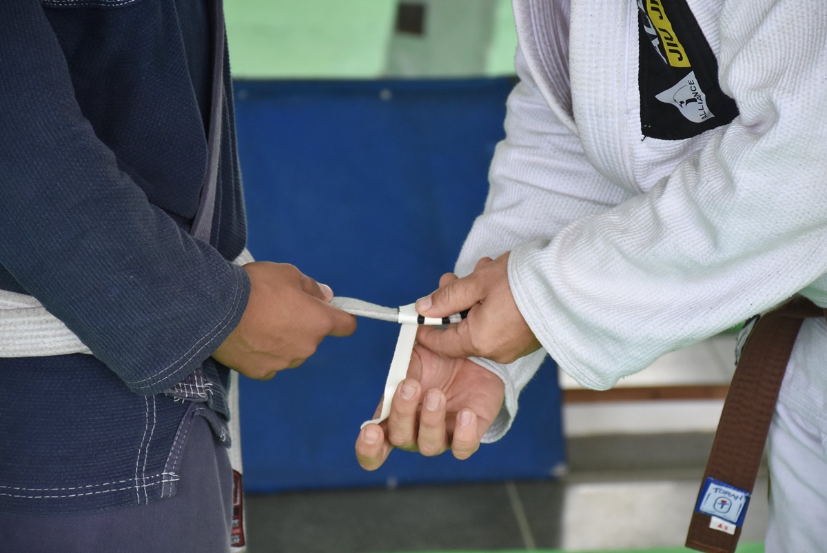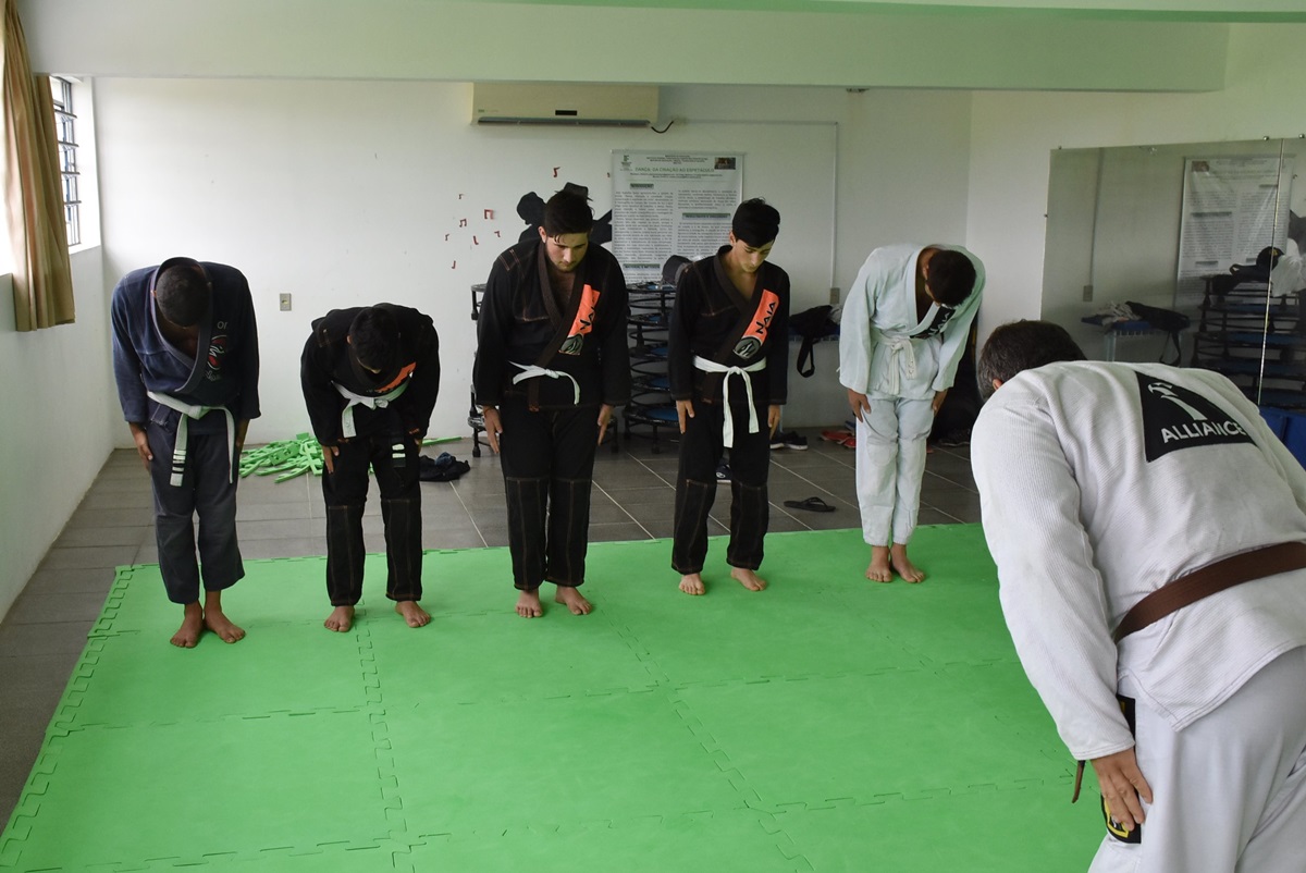 Projeto de ensino do jiu-jítsu concede graus na faixa branca a cinco alunos
