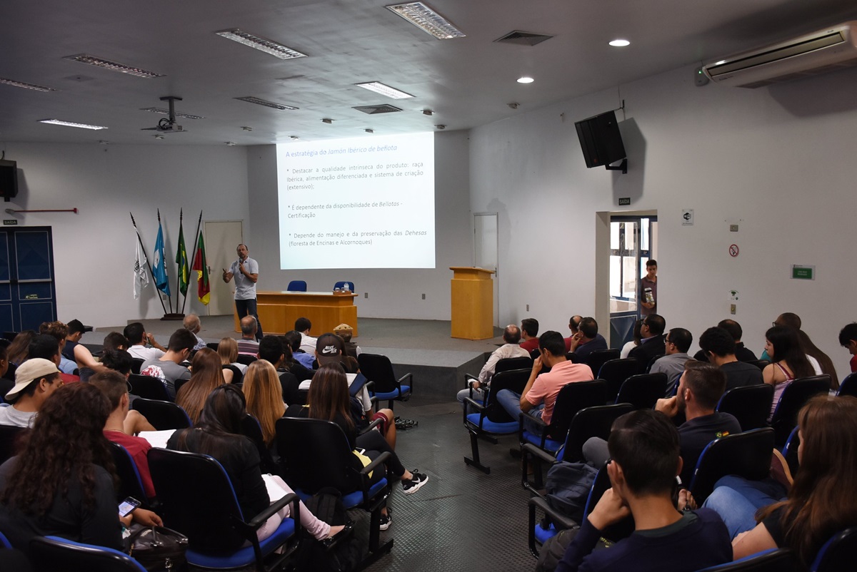 Em um segundo momento, o professor Adriano Garcia Rosado Júnior, do Campus SVS, abordou “Às denominações de origem como marca regional - O caso do presunto pata negra Espanhol”, compartilhando sua experiência na Espanha. Durante visita ao país, o professor teve a oportunidade de conhecer todo o processo de produção do presunto ibérico, desde a criação dos suínos até o balcão. Adriano destacou o potencial que produtos diferenciados, com características locais, podem ter no mercado; bastando incentivo, pesquisa, atitude e criatividade para tornar isso uma realidade para o mercado nacional (no Brasil, há 49 produtos com denominação de origem ou marca local/regional ).