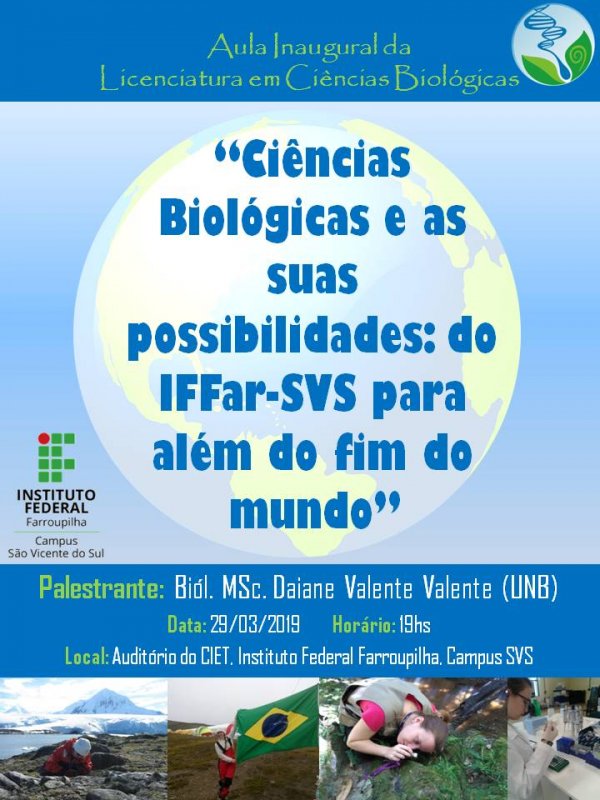 O tema será "Ciências Biológicas e suas possibilidades: Do IFFar- SVS para além do fim do mundo" com a palestrante Daiane Valente Valente. Daiane é egressa da Turma 1 de Licenciatura em Ciências Biológicas deste campus, mestre em Biologia pela UNIPAMPA (São Gabriel, RS) e atualmente cursa doutorado na UNB (Brasília, DF), tendo atuado recentemente em projetos na Holanda e Antártida.