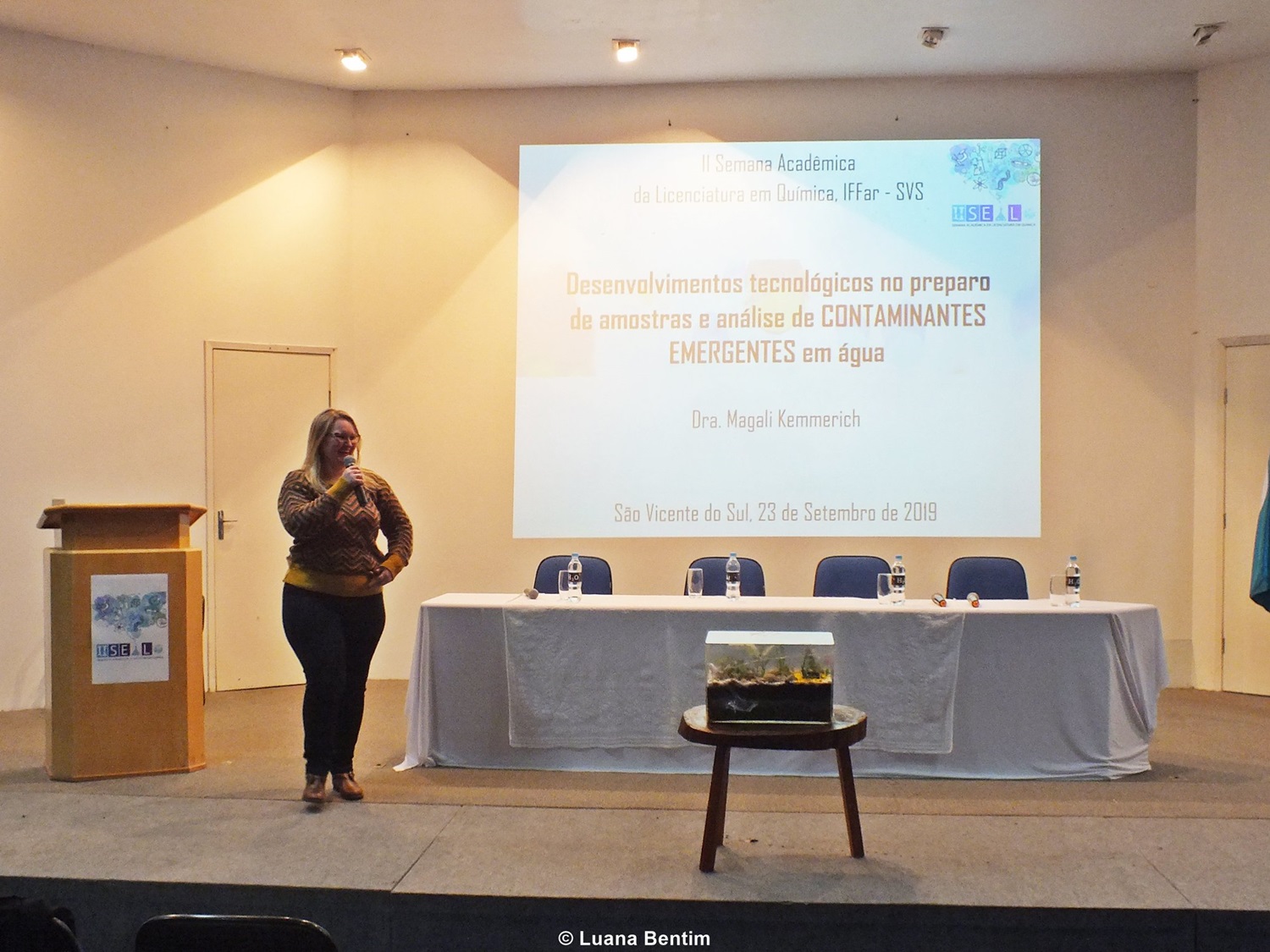 No primeiro dia de evento, houve palestra sobre o desenvolvimento tecnológico na análise de contaminantes emergentes em água, com Magali Kemmerich, pós-doutoranda no Programa de Pós-Graduação em Fitossanidade da Universidade Federal de Pelotas (UFPel-RS), que apresentou os avanços de técnicas instrumentais e de preparo dessas amostras.