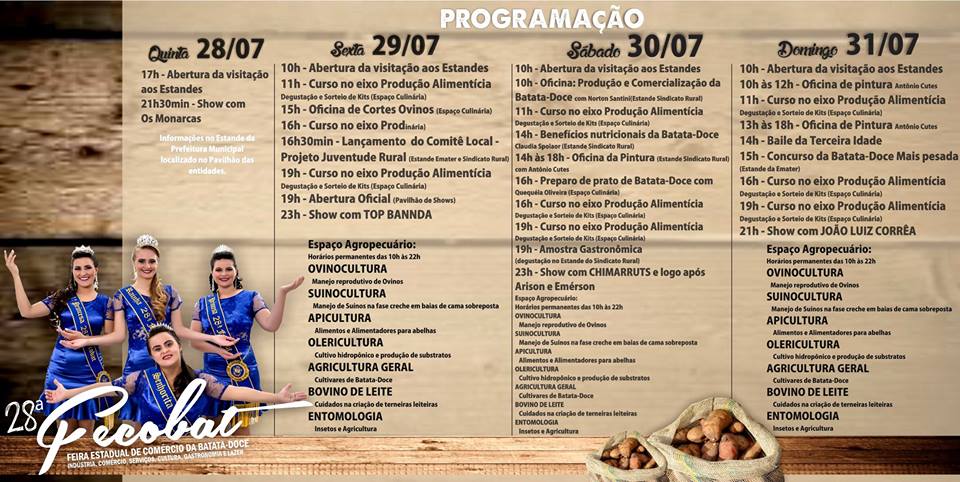 O IFFarroupilha - Campus São Vicente do Sul em mais um ano estará presente na 28º Feira Estadual de Comércio da Batata Doce - FECOBAT, que acontece de 28 a 31/07/2016, em São Vicente do Sul.