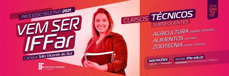 As incrições para o Processo Seletivo para Cursos Técnicos Subsequentes do Instituto Federal Farroupilha vão até 1º de fevereiro. A seleção será por sorteio eletrônico. As inscrições são gratuitas e devem ser realizadas de forma online através do site http://ingresso.iffarroupilha.edu.br/.
