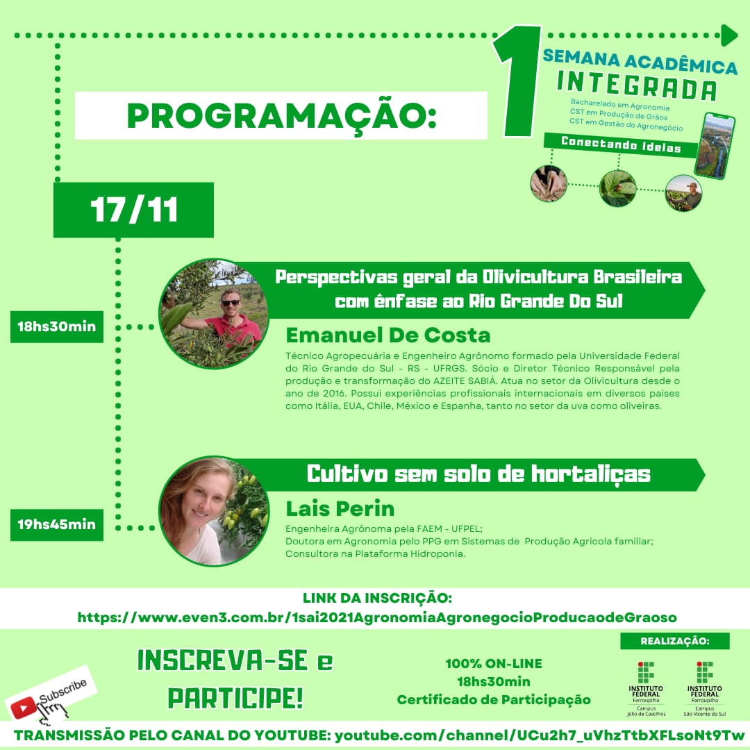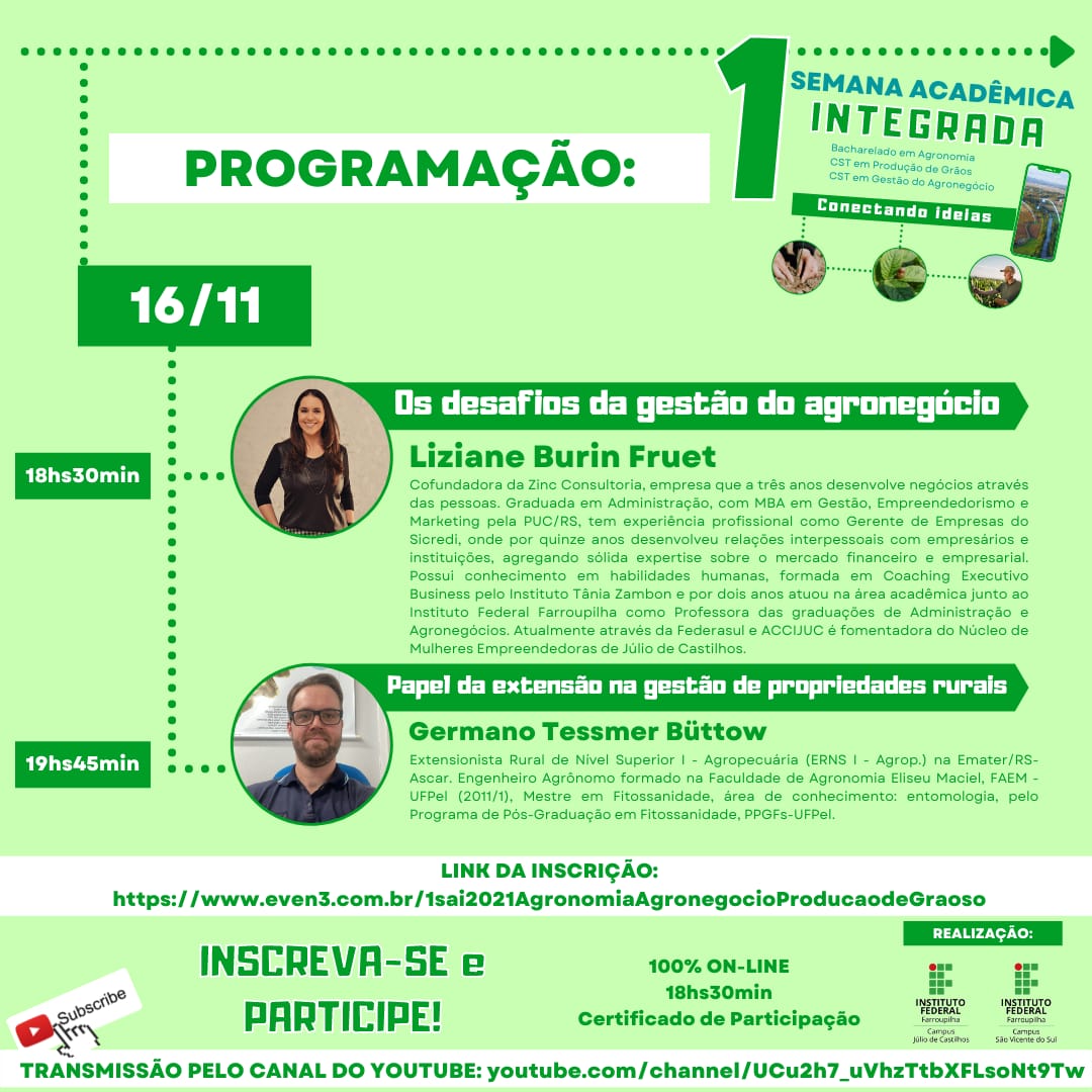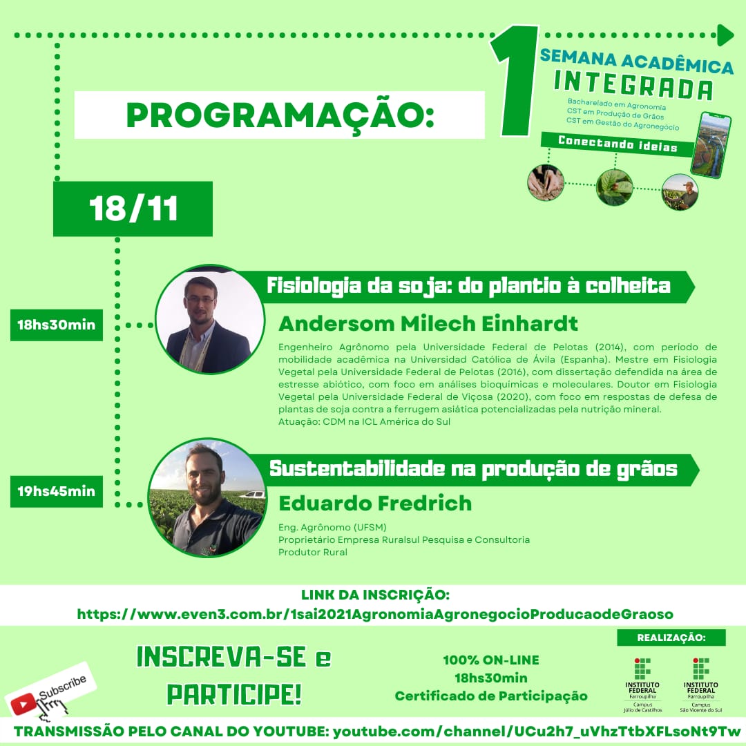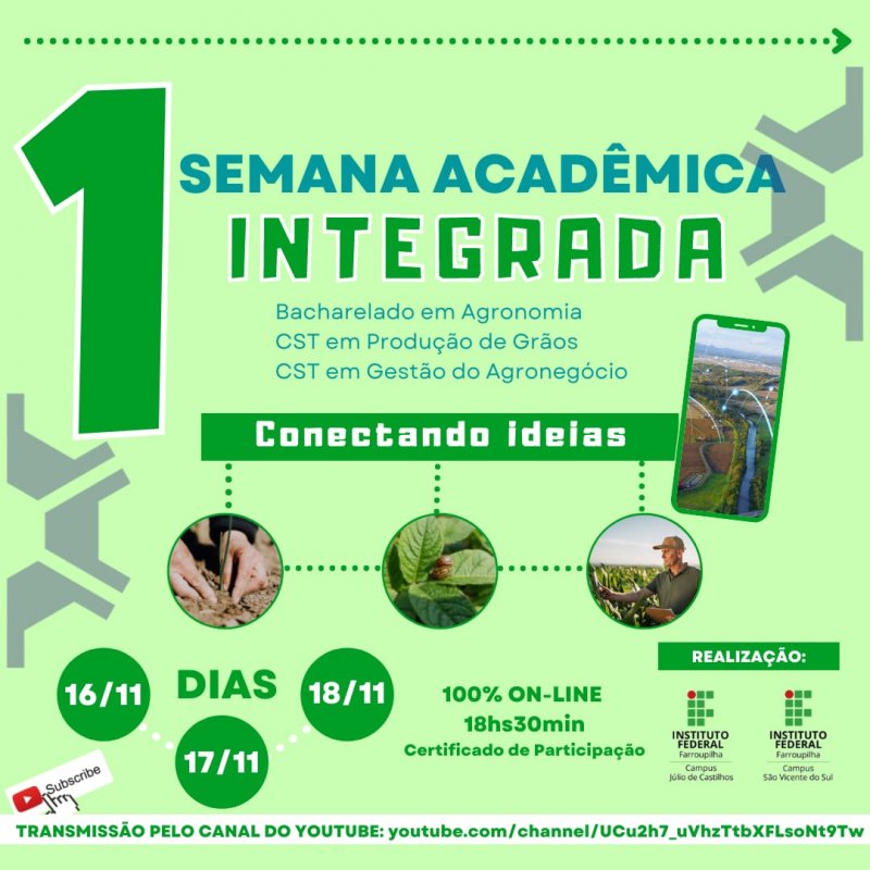 De 16 a 18 de novembro, acontece a 1ª Semana Acadêmica Integrada dos cursos de Bacharelado em Agronomia, CST em Produção de Grãos e CST em Gestão do Agronegócio do IFFar - Campi São Vicente do Sul e Júlio de Castilhos.