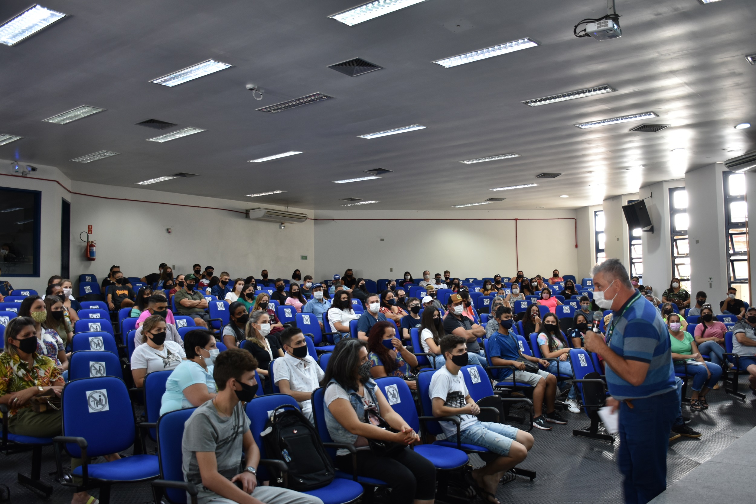 Calouros e calouras – que estavam acompanhados de um/a responsável -, receberam as orientações iniciais da equipe da Direção de Ensino, como o Setor de Assistência Pedagógica, Coordenação de Assistência Estudantil, assim como as Coordenações de cada curso.