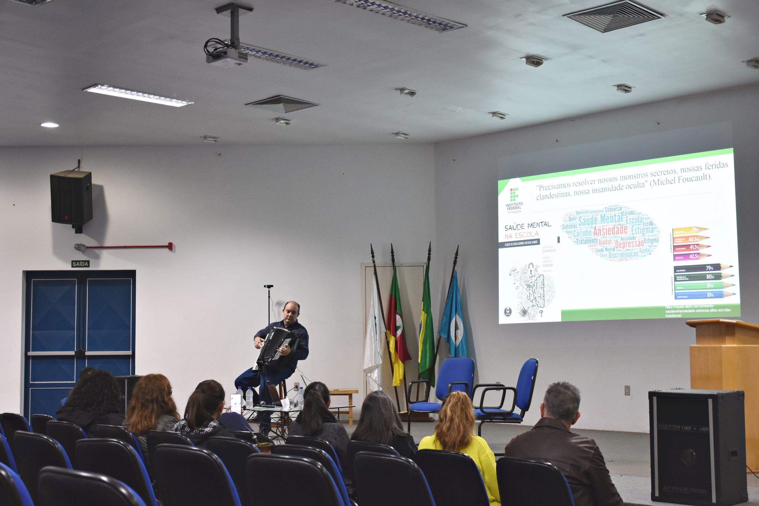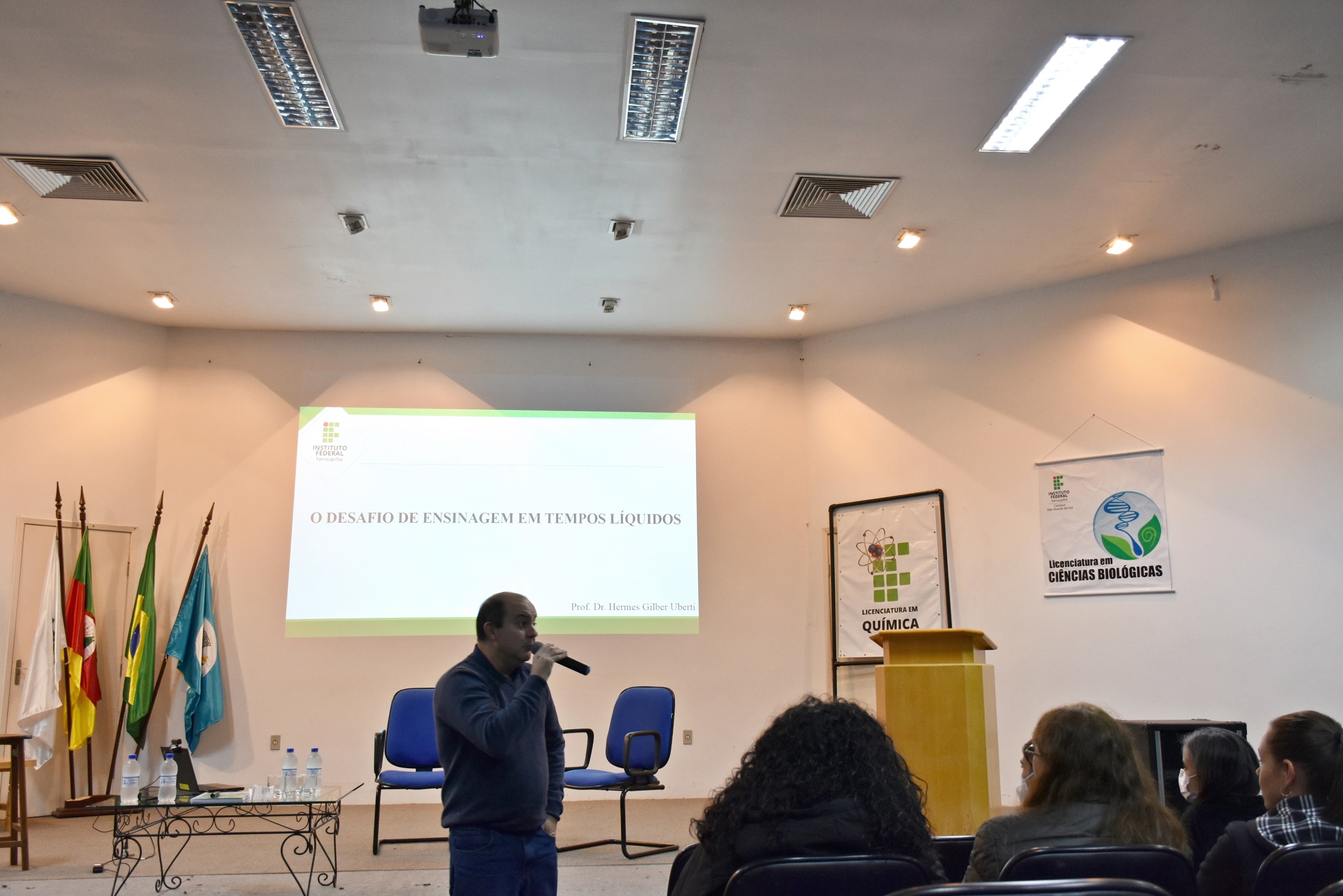 Após momento musical com o aluno Antônio José do Nascimento Neto, a palestra de abertura abordou os desafios da ensinagem em tempos líquidos e foi ministrada pelo prof. dr. Hermes Uberti, atual diretor de Assistência Estudantil do IFFar. O termo Ensinagem refere-se a uma prática social e crítica entre os sujeitos, professor e aluno, englobando tanto a ação de ensinar quanto a de apreender.