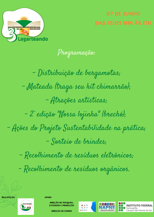No campus SVS, as atividades estão sendo organizadas pelo Projeto Pilares da Sustentabilidade, com apoio da Direção de Ensino e da Diretoria de Pesquisa, Extensão e Produção.