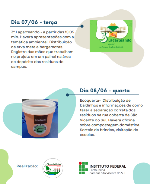 A Semana do Meio Ambiente do Campus SVS se encerra no dia 8 à tarde, com a Ecoquarta. Na oportunidade, haverá oficinas de compostagem, com a distribuição de baldinhos para a coleta de resíduos orgânicos (em troca de doações de alimentos), além de exposição e apresentação de ações e projetos com temática ambiental e distribuição de materiais informativos sobre educação ambiental. As ações vão ocorrer na praça municipal (Rua Coberta) de São Vicente do sul, a partir das 13h30min.