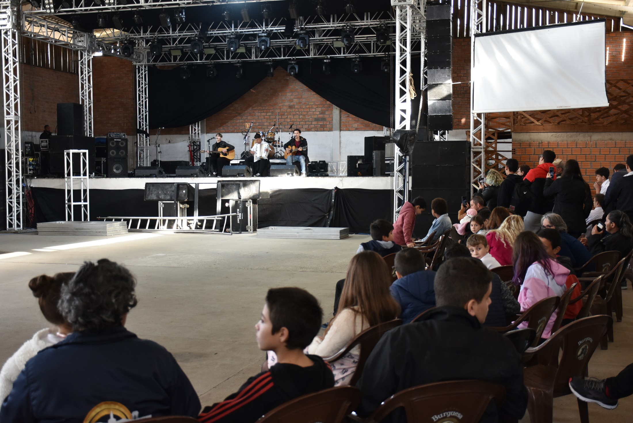 Na mostra cultural da Feira, ocorrida nesta tarde, houve apresentação dos estudantes Diony Joras, Luis Fernando Lopes e Manuela Baccin, com a canção "Milonga abaixo de mau tempo".
