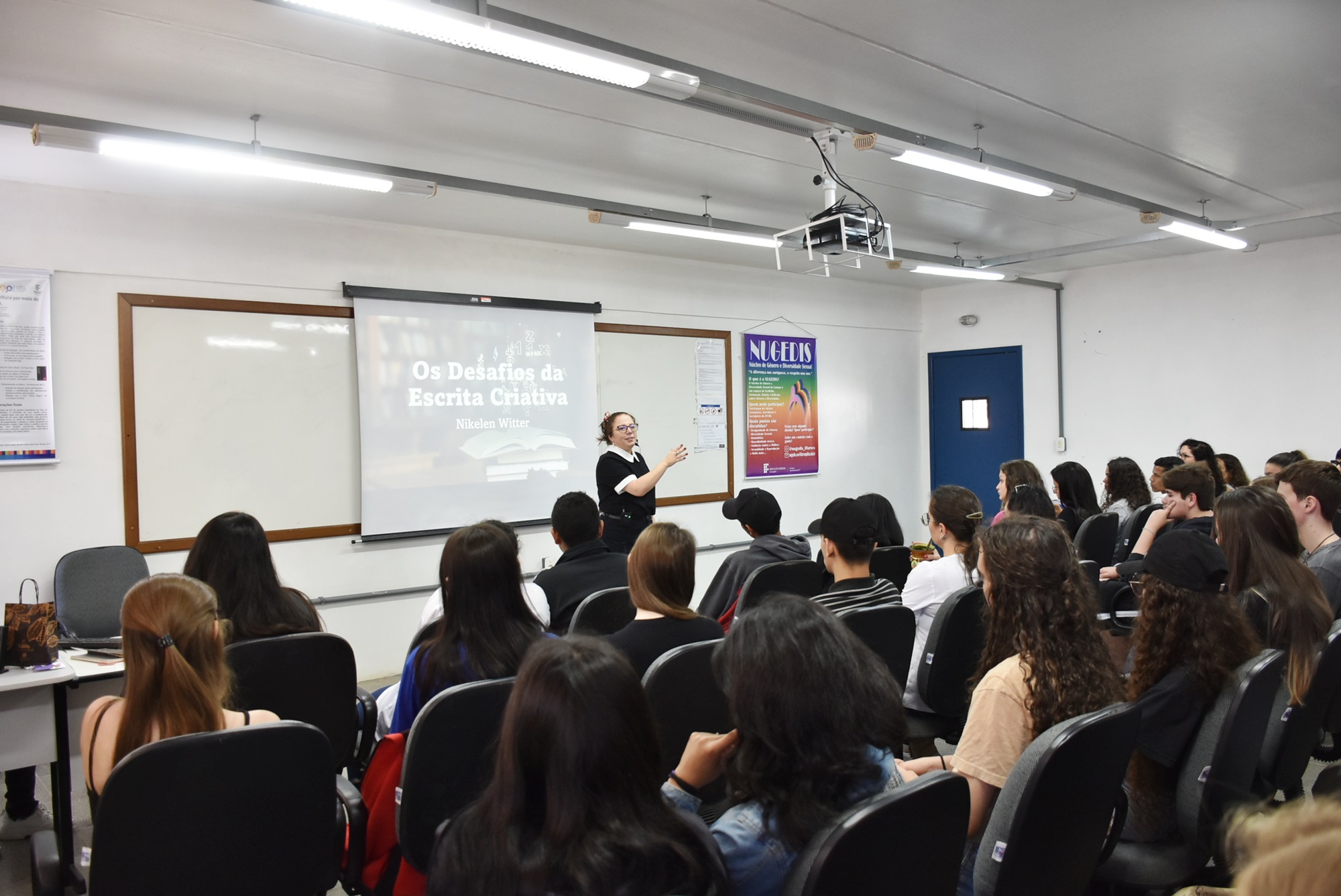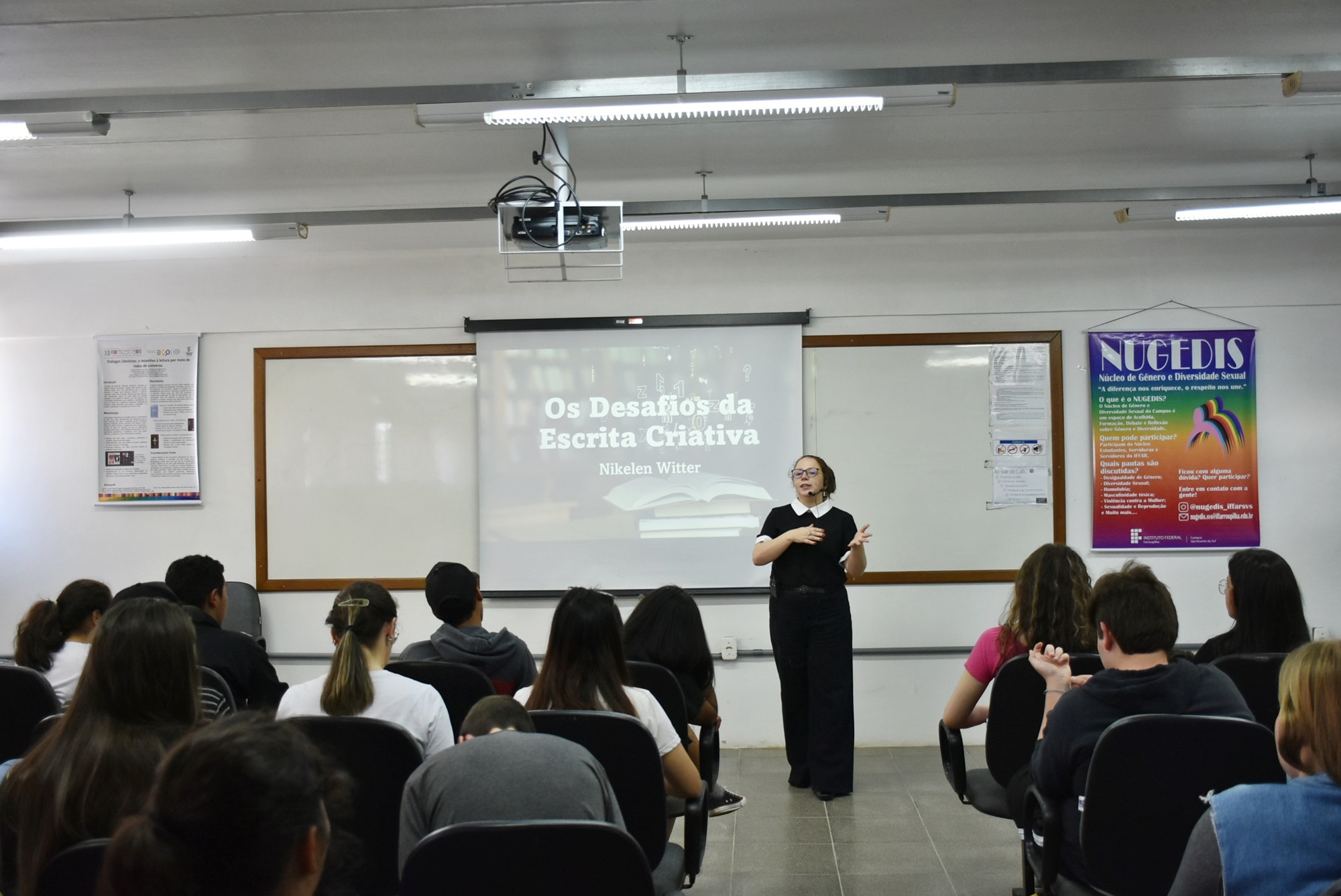 Na última quarta-feira, dia 19 de outubro, estudantes do Campus São Vicente do Sul participaram de palestra sobre Escrita Criativa, com a escritora Nikelen Witter, que foi vencedora do Prêmio Açorianos no ano passado, com a obra “Dezessete Mortos”.