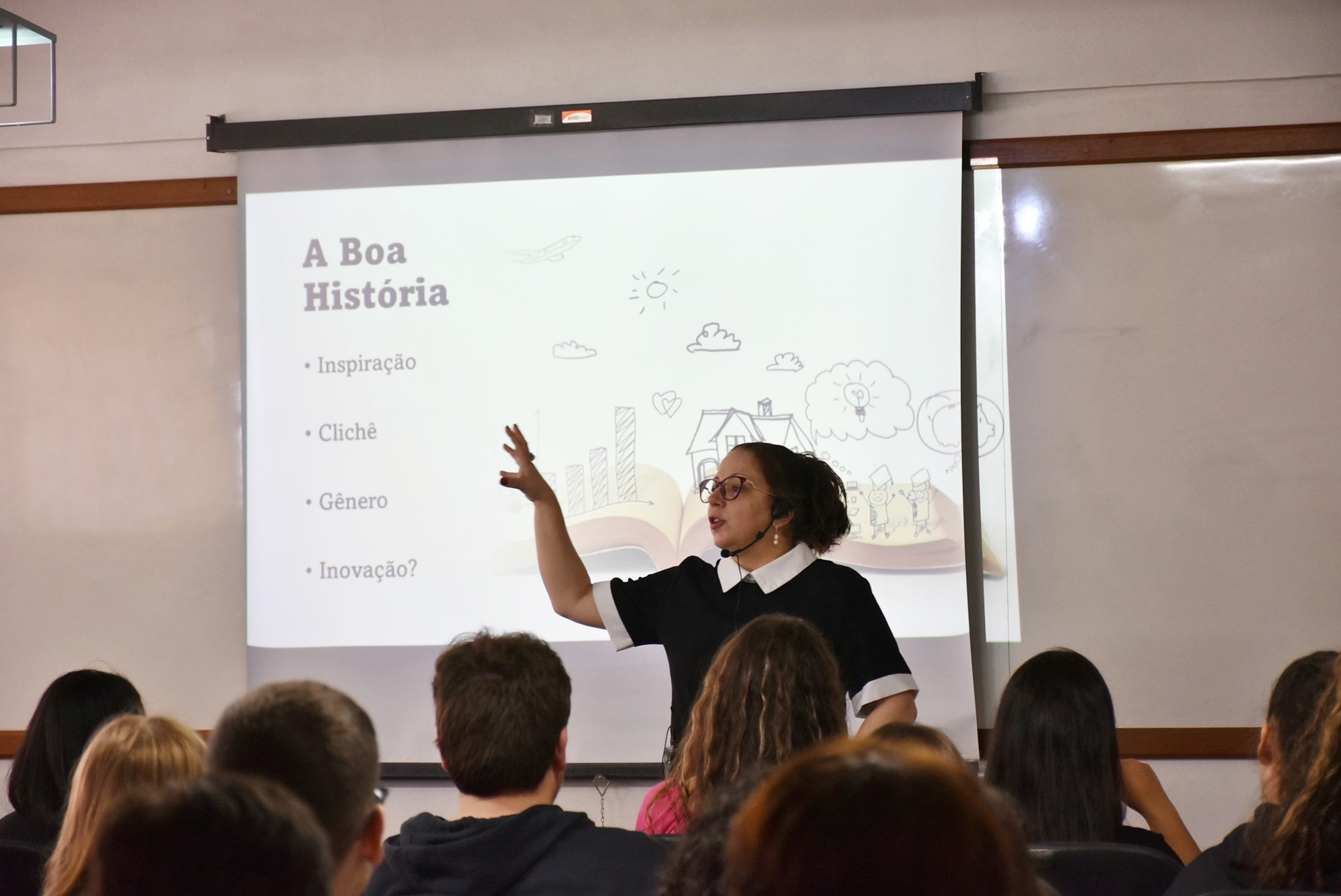 No final, houve um bate-papo com os/as estudantes, que puderam comentar sobre as diferentes obras com a autora e outras curiosidades.