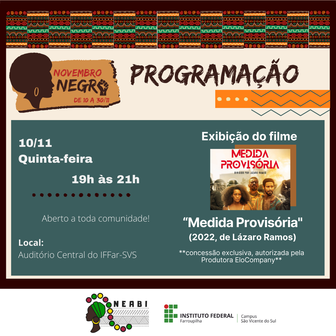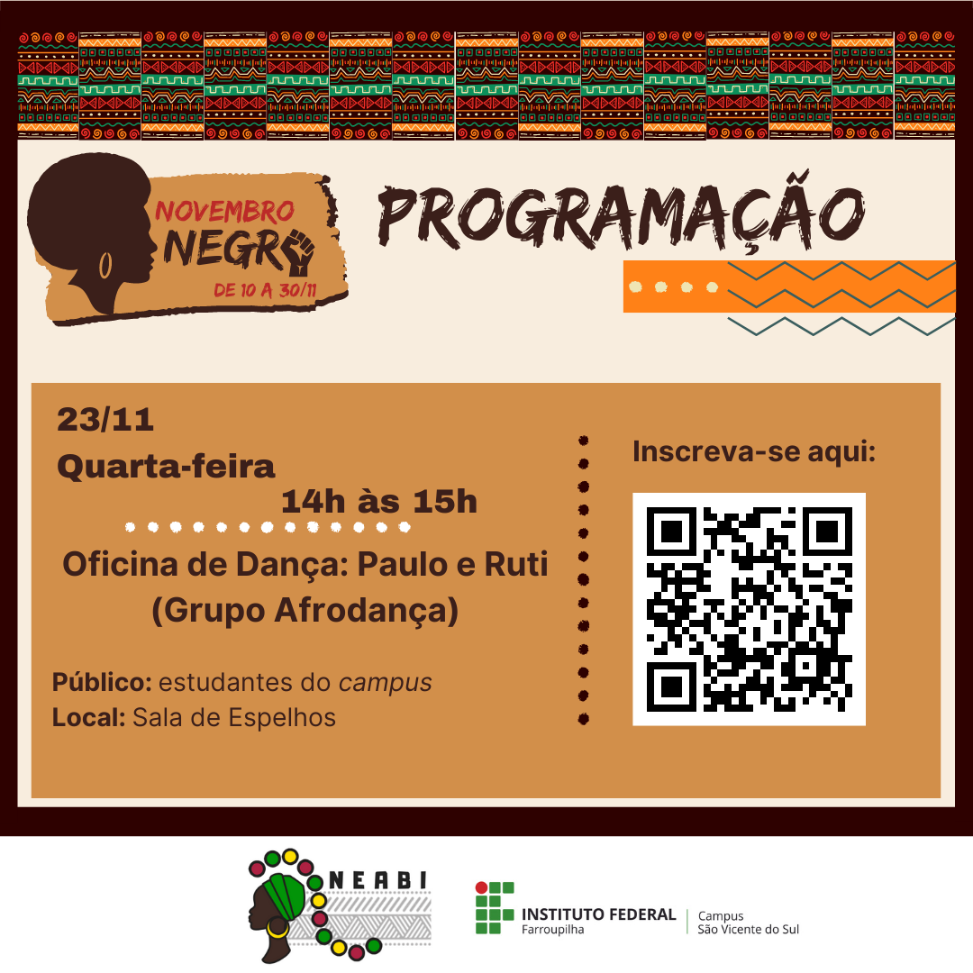 De 10 a 30 de novembro, a comunidade escolar e acadêmica do Instituto Federal Farroupilha – Campus São Vicente do Sul e comunidade externa poderão conferir as atividades relacionadas ao Novembro Negro, que busca refletir sobre problemáticas e lutas da população afro brasileira, além de marcar o dia 20/11, Dia Nacional da Consciência Negra.