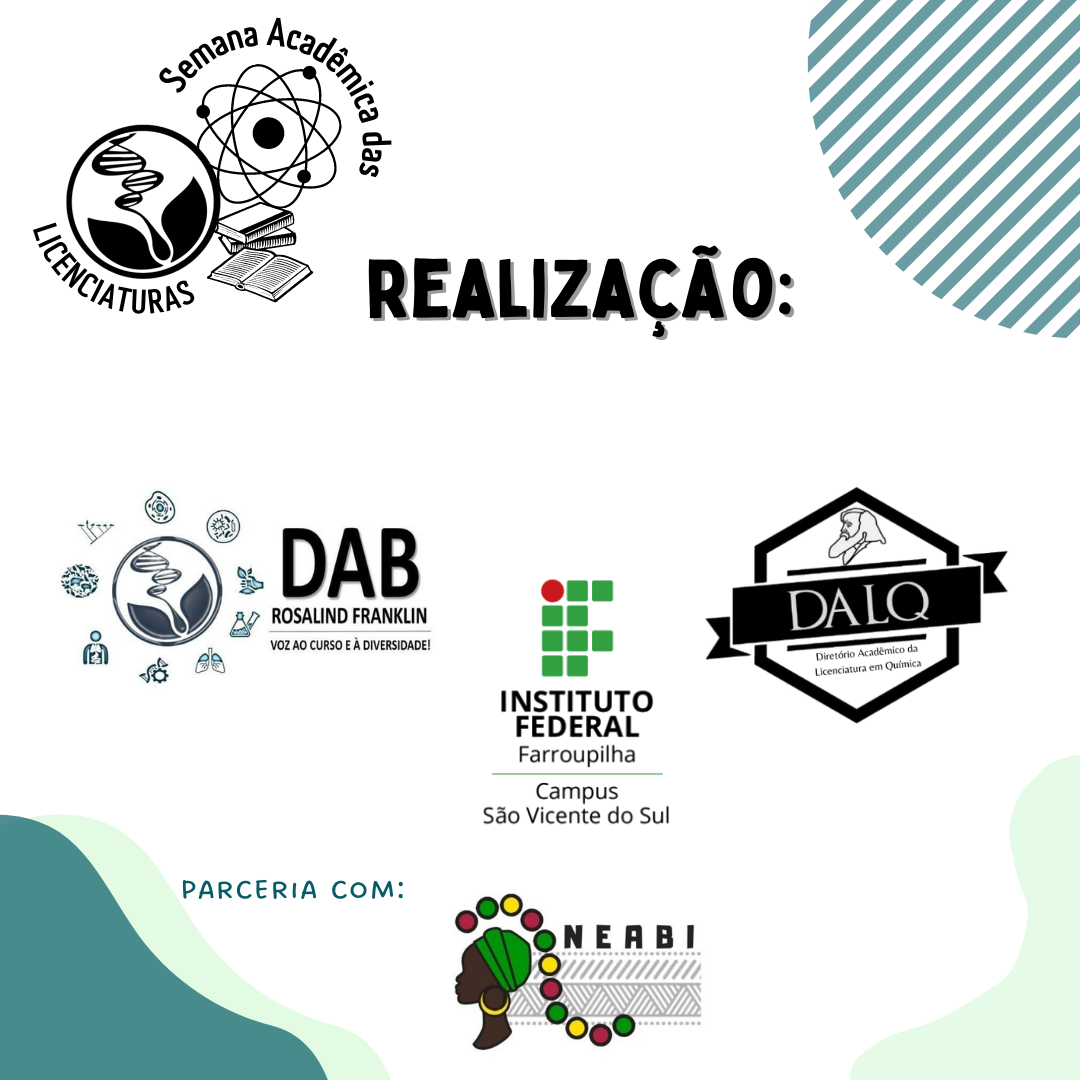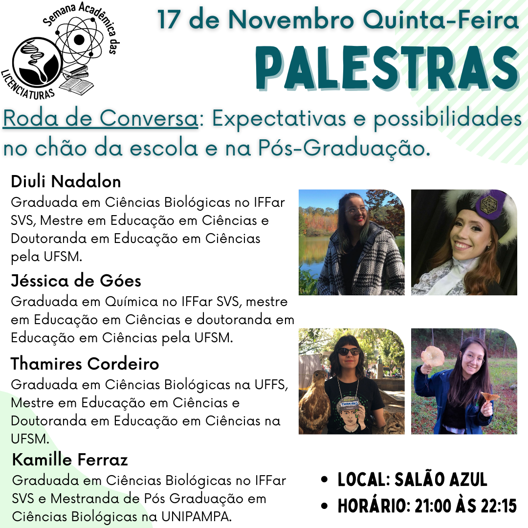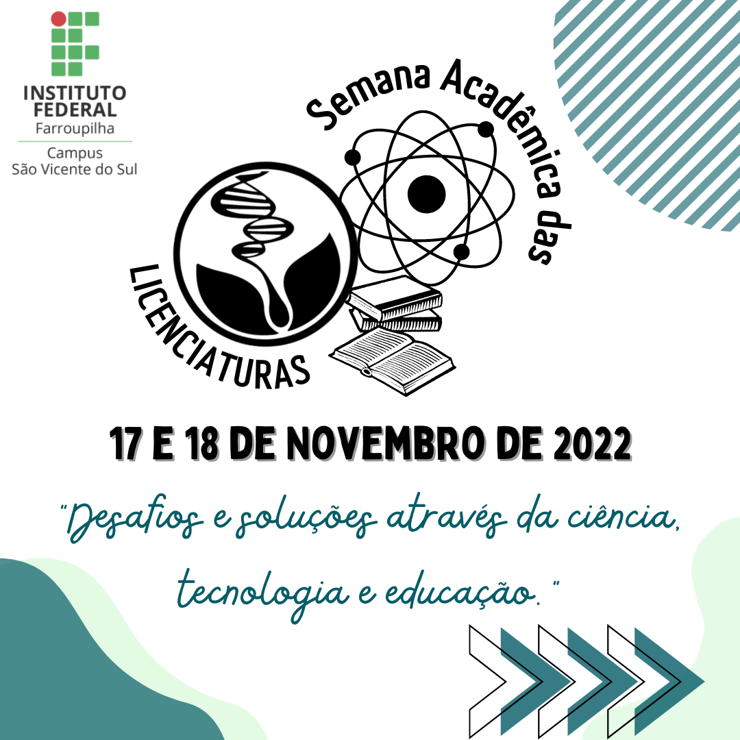 Os cursos de Licenciatura em Ciências Biológicas e Licenciatura em Química do IFFar SVS realizam - nos dias 17 e 18 de Novembro - a Semana Acadêmica das Licenciaturas. Com o lema "Desafios e soluções através da ciência, tecnologia e educação", o evento acontece no turno da noite e traz palestras e minicursos. Confiram abaixo a programação: