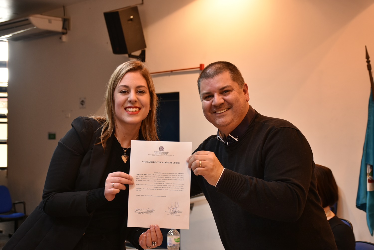 A cerimônia ocorreu no Auditório Central do Campus São Vicente do Sul e contou com a presença do Diretor Geral do Campus, prof. Deivid Buttinger Dutra de Oliveira; da Chefe de Gabinete, Assistente Administrativa Thaís Ferreira Colombo; dos Coordenadores de Curso, profs. Cristiano Martins Vieira e Eduardo Anibele Streck, profs.ª Ana Luiza Paz e Lenice Marques, além de amigos e familiares.