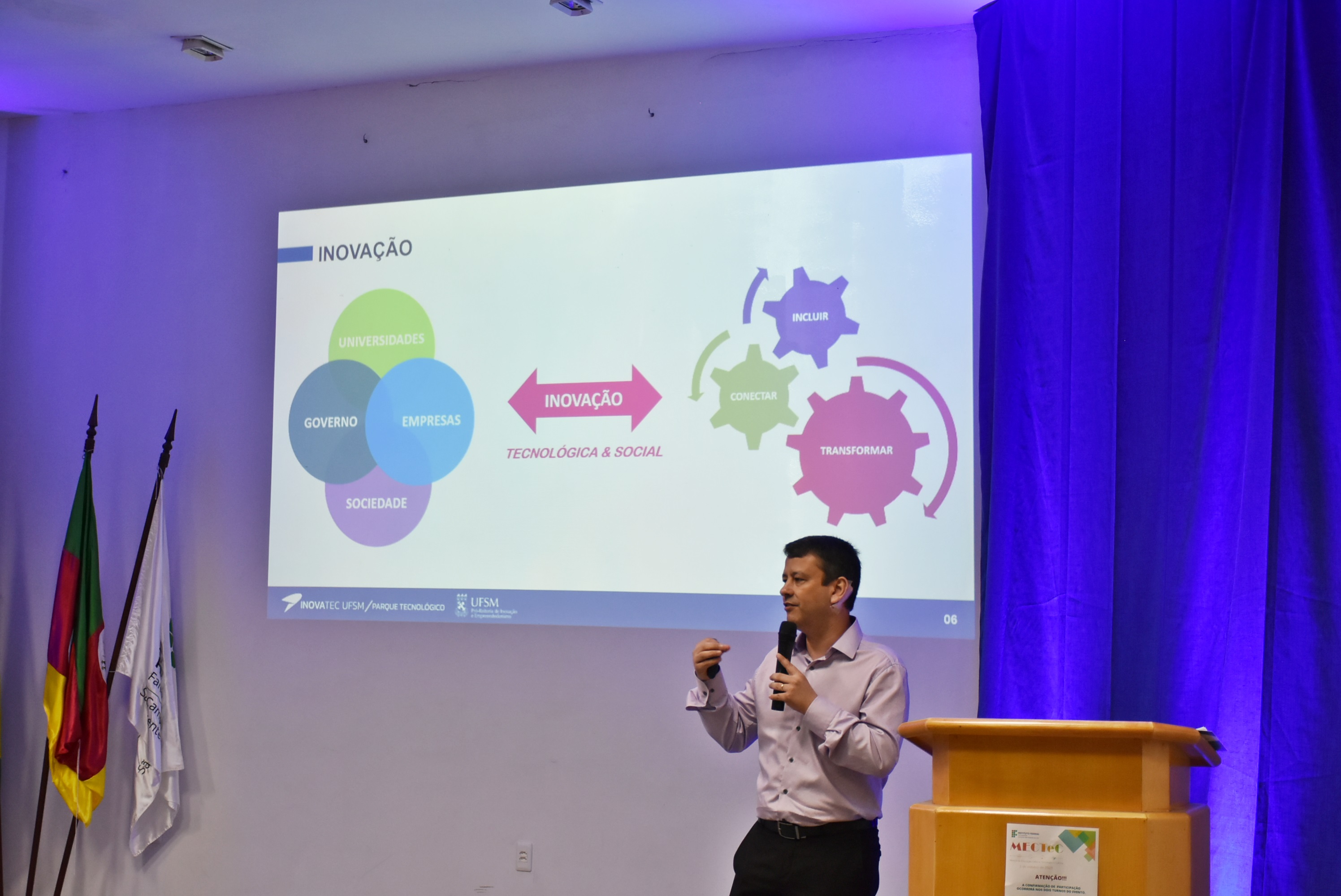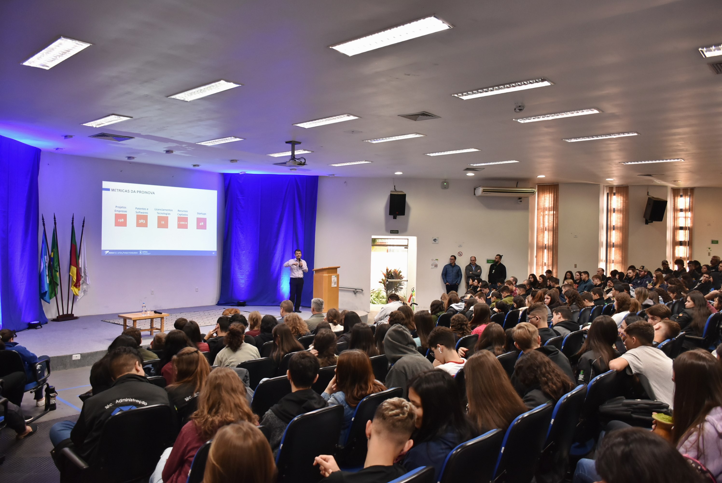 A palestra de abertura foi ministrada por Daniel Pinheiro Bernardon, pró-reitor de Inovação e Empreendedorismo (PROINOVA) da Universidade Federal de Santa Maria, e abordou os desafios e as perspectivas dessas áreas, principalmente, dentro das instituições federais. Na parte da manhã, também aconteceram as apresentações da Mostra Cultural Interna, evento organizado pelo Núcleo de Arte e Cultura do campus, que se configura em um show de talentos do campus, com música, dança e performances diversas.